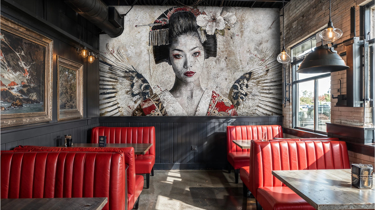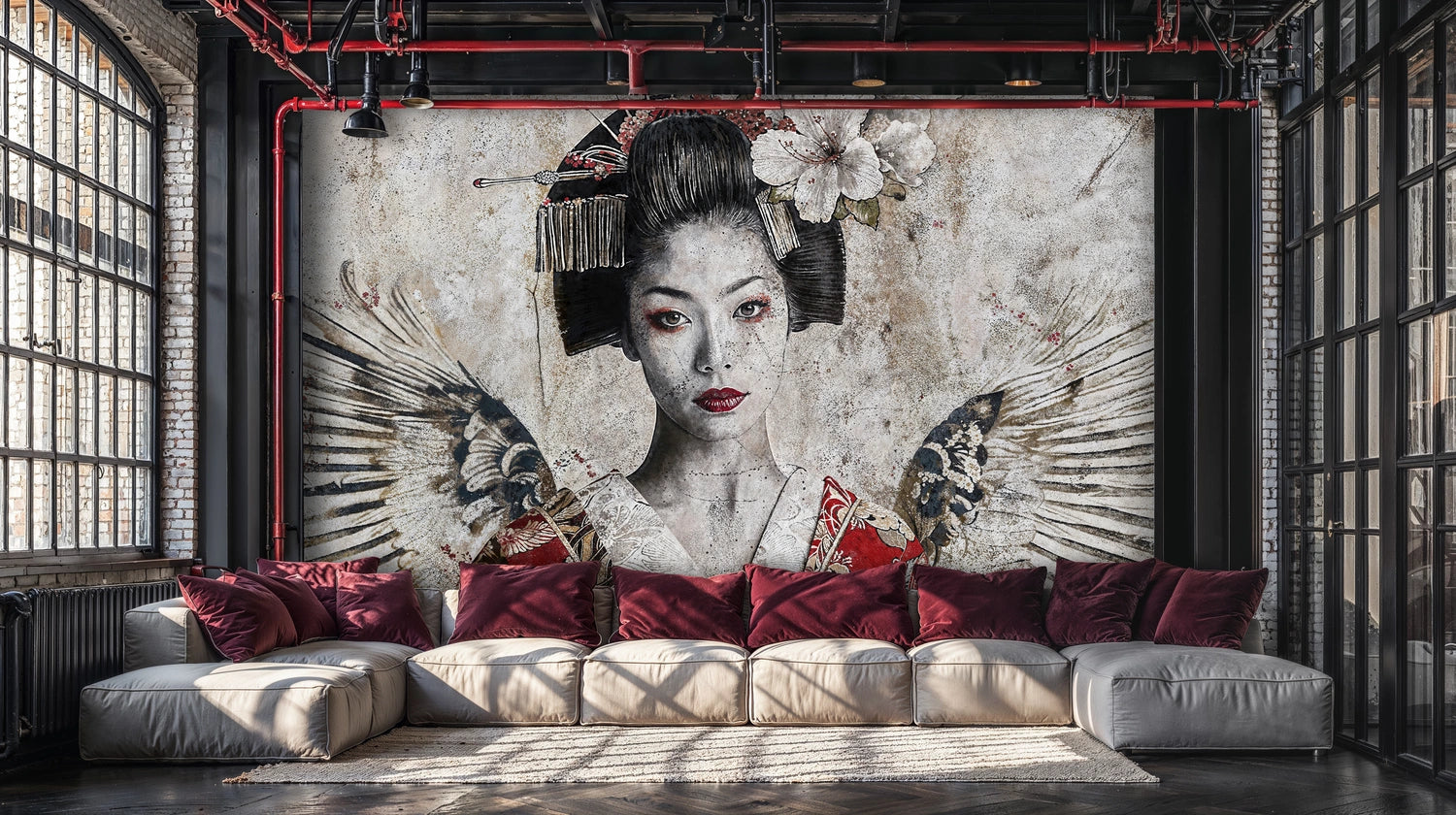Imagine a quiet room caught between shadow and light, where a serene gaze anchors the space and wings seem to unfurl across weathered plaster. This Wall Mural blends hand-drawn portraiture with ink-wash textures and ornate kimono motifs, creating a layered patina that feels both refined and untamed. The palette drifts from stone and charcoal to flashes of vermilion and soft blossom, inviting a mood of calm strength. Inspired by Japanese artistry and modern collage techniques, the composition reads like a story paused mid-flight—elegant, mysterious, unforgettable. Designed by Atelier Merien, it becomes an instant focal wall that transforms dining corners, lounges, and entryways into immersive scenes.