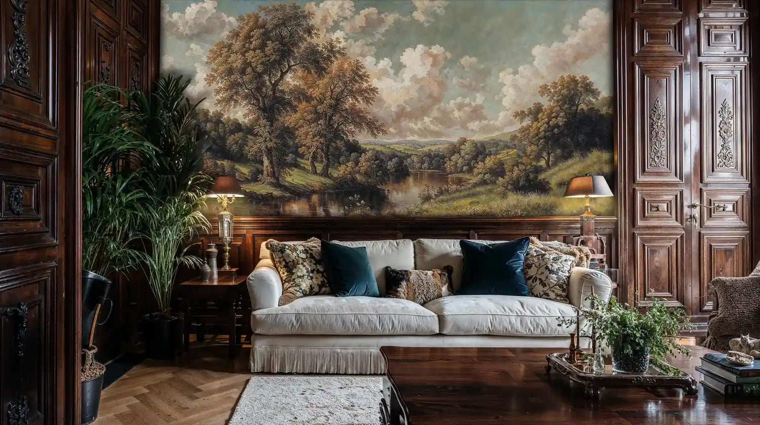 Step into the serene beauty of rolling English countryside with this breathtaking Wall Mural that captures the essence of nature's most peaceful moments. Inspired by classical landscape paintings, this design transports you to a tranquil river valley where ancient oak trees cast gentle shadows over meandering waters and verdant meadows stretch toward distant hills. The soft, muted palette of sage greens, warm browns, and cloudy grays creates an atmosphere of quiet contemplation and natural elegance. Each brushstroke detail has been carefully preserved by Atelier Merien to bring museum-quality artistry directly to your walls, transforming any room into a window to the countryside.