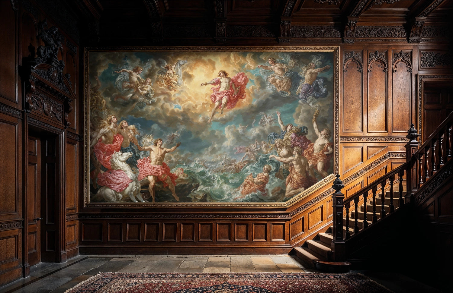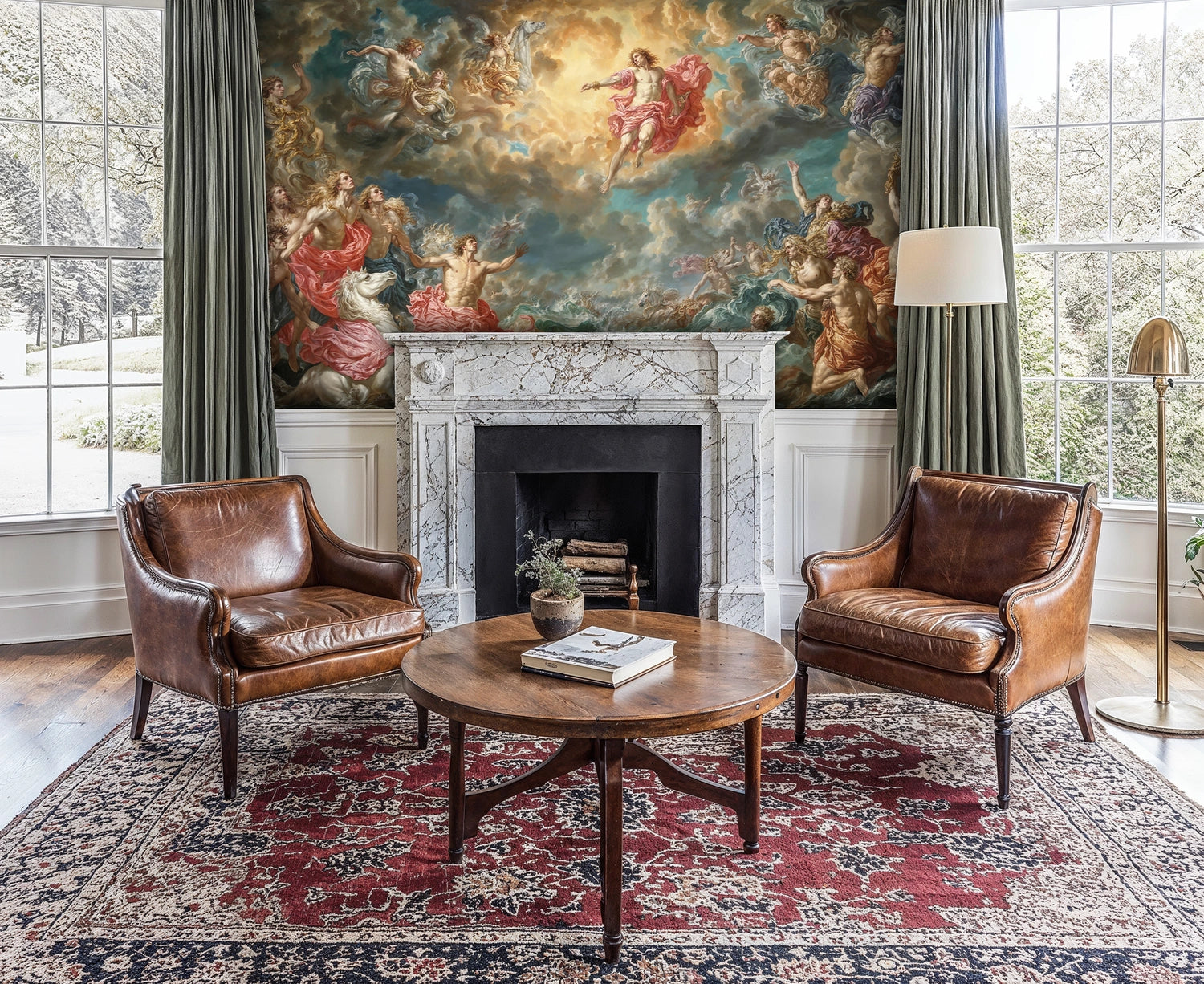 Step into a realm where divine mythology meets artistic grandeur. This breathtaking Wall Mural captures the eternal dance of celestial beings amidst swirling clouds and golden light, bringing the majesty of classical oil paintings into your modern space. Inspired by the timeless tradition of grand fresco artistry, each figure seems to float with ethereal grace against a backdrop of azure skies and luminous atmosphere. Atelier Merien presents this extraordinary piece as more than decoration - it's a portal to the sublime, transforming any room into a sanctuary of artistic wonder.