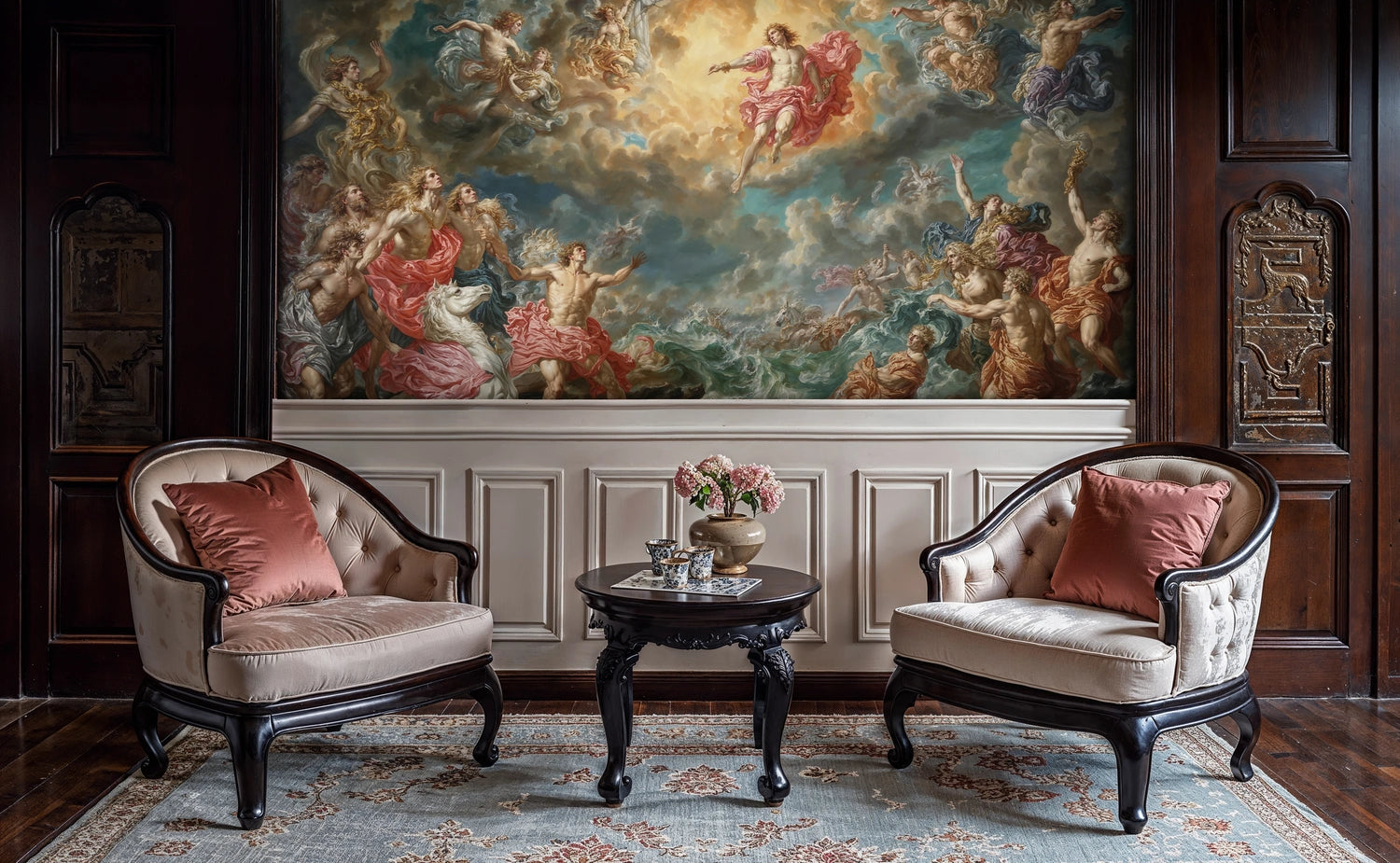 This magnificent mural works beautifully in formal dining rooms where it can serve as a conversation centerpiece, or in grand living spaces where it adds cultural sophistication. The classical styling pairs exquisitely with rich fabrics, antique furnishings, and modern minimalist pieces alike, making it a versatile choice for discerning decorators.