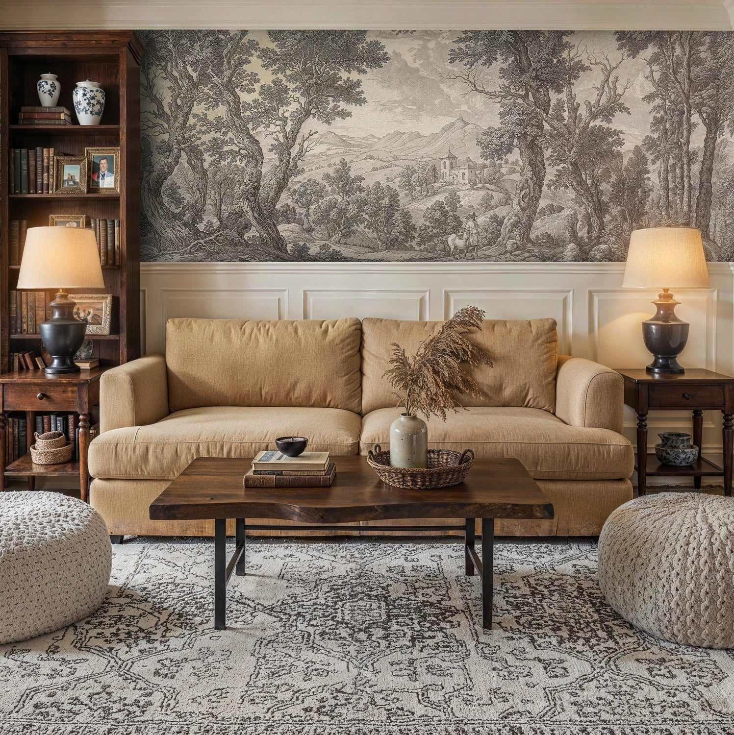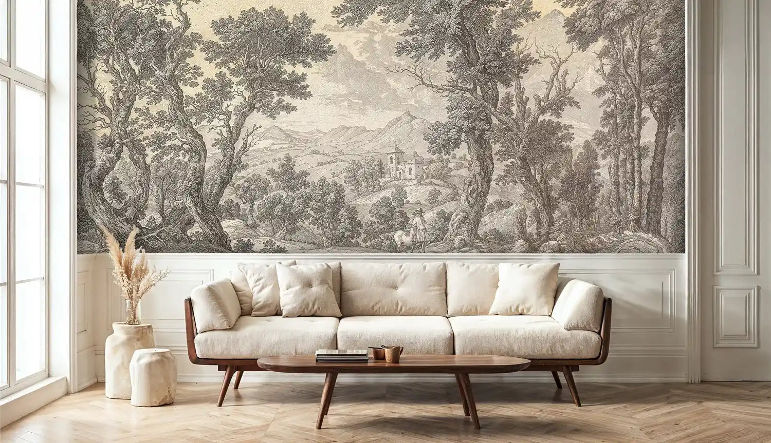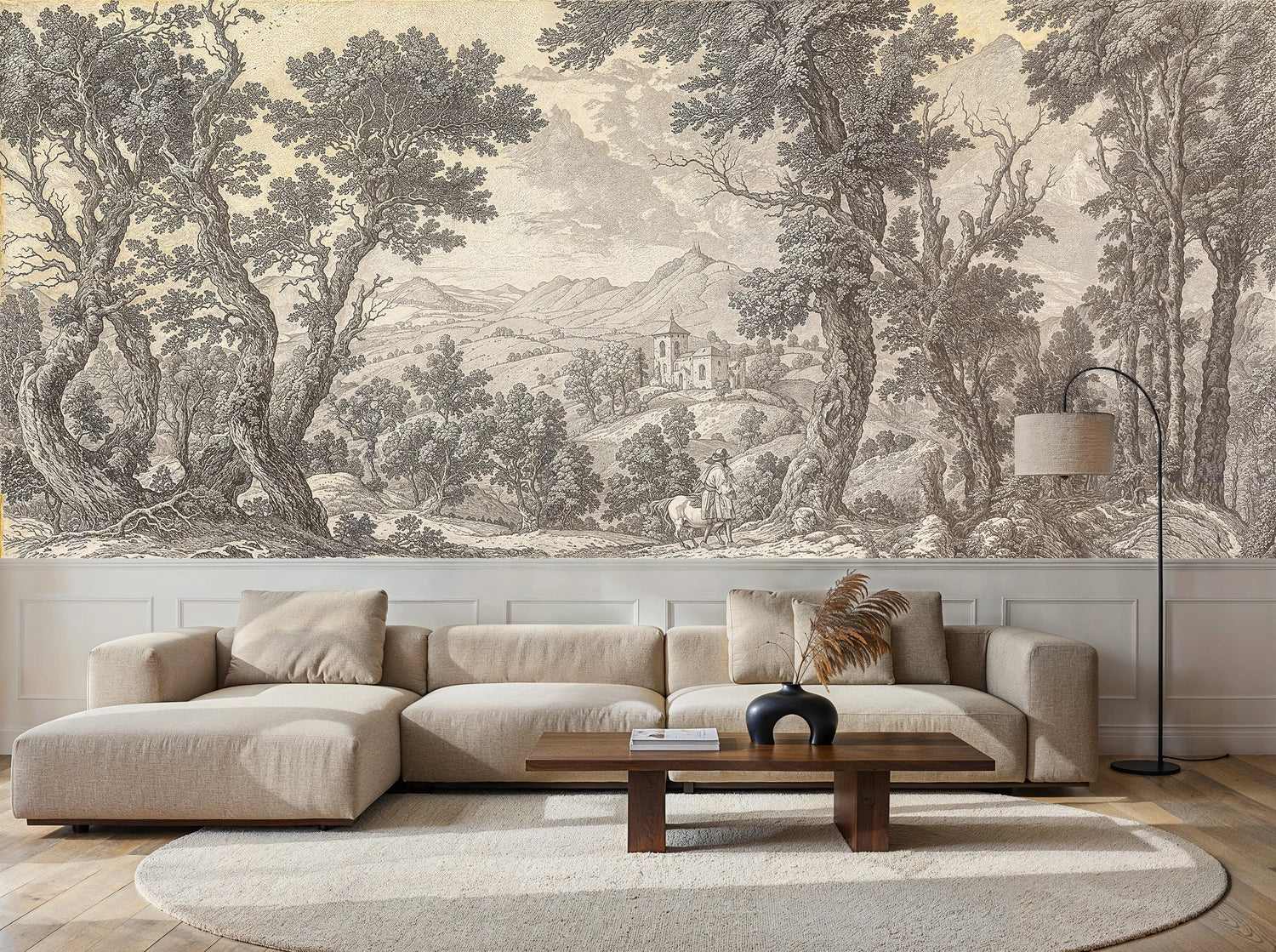 This magnificent wall mural showcases the intricate beauty of traditional landscape art, featuring majestic oak trees, rolling meadows, and distant mountains that create incredible depth and dimension. The monochromatic palette of warm beiges and rich grays allows this piece to complement virtually any color scheme while maintaining its dramatic visual impact.