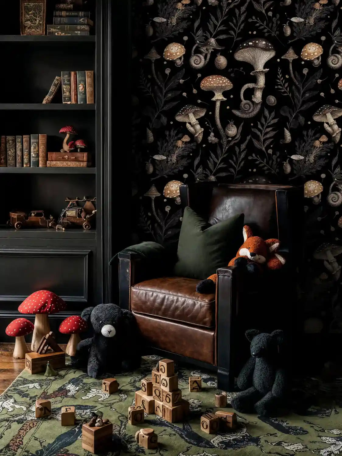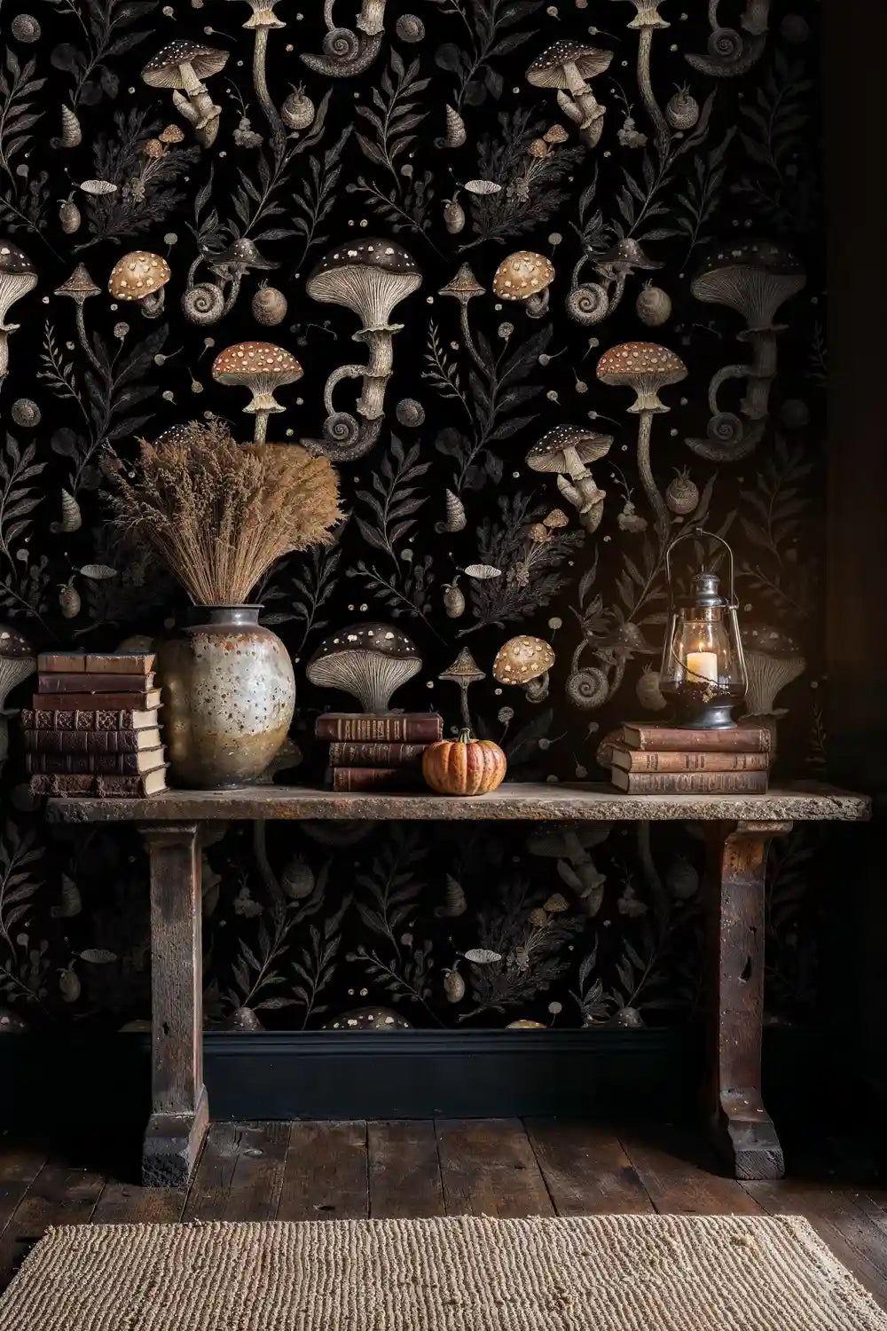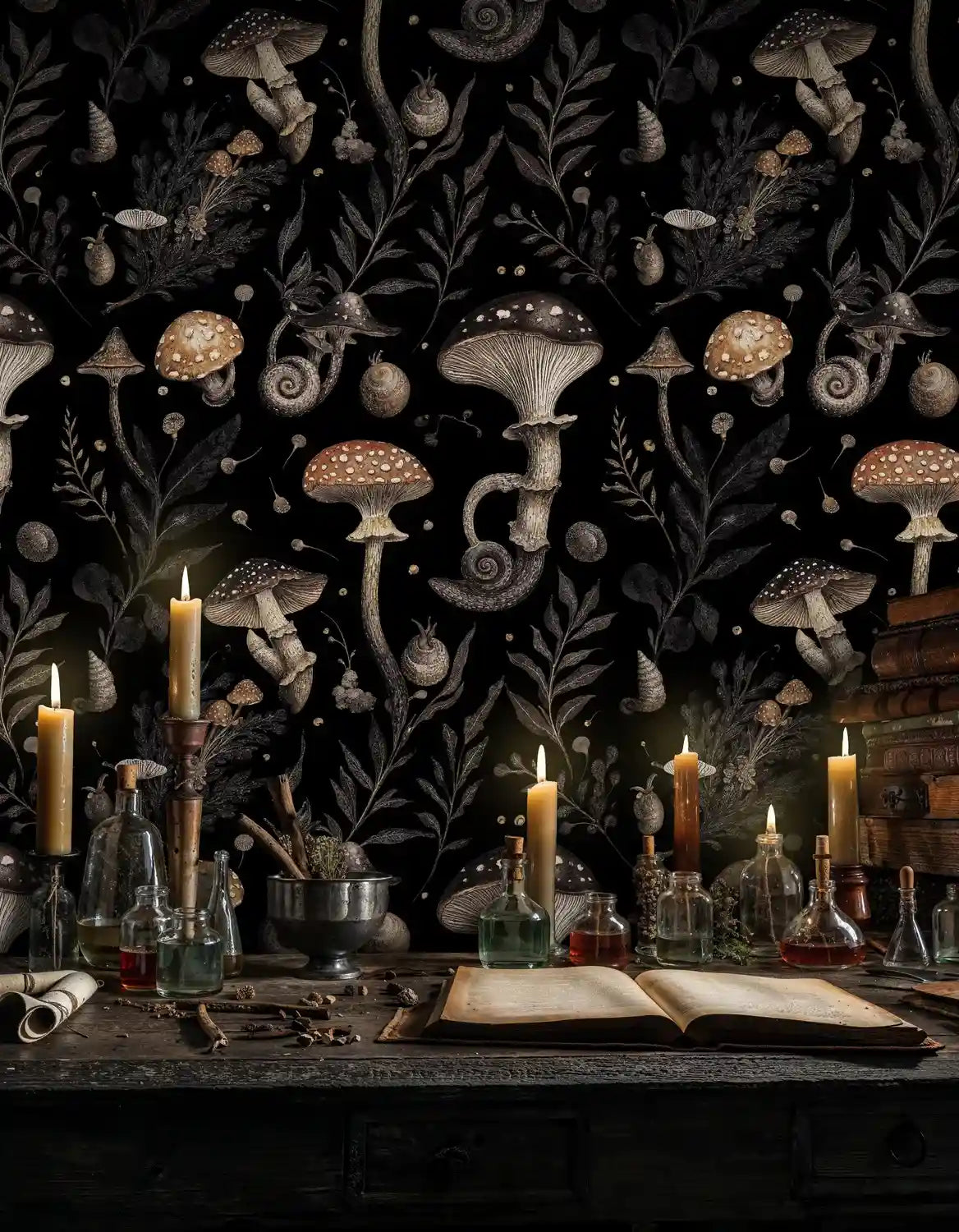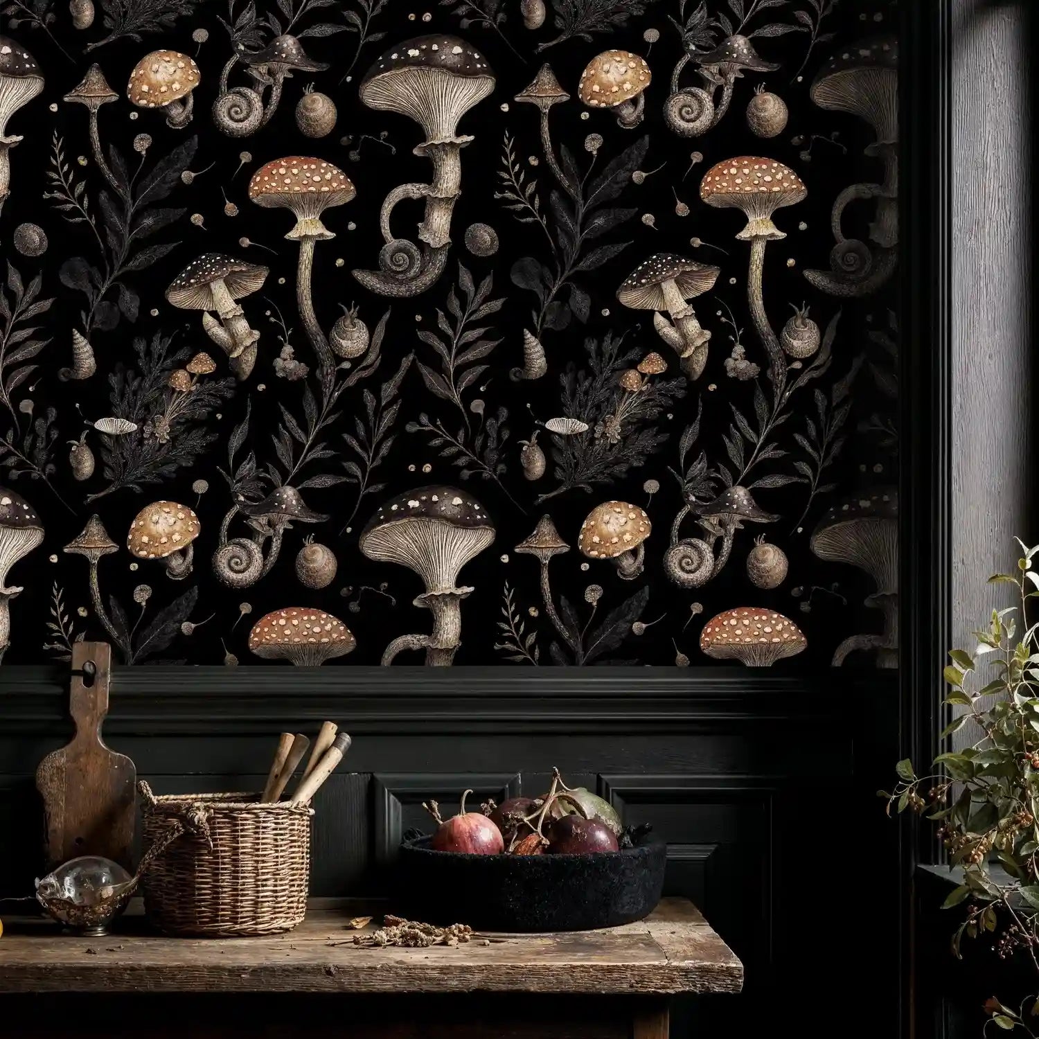Lean into its moody botanical character with vintage books, aged brass, and leather, or brighten the palette with natural linens and warm woods. This mushroom wallpaper works as a dramatic feature wall or wrapped around a cozy nook, adding texture and story to living rooms, bedrooms, or entryways.