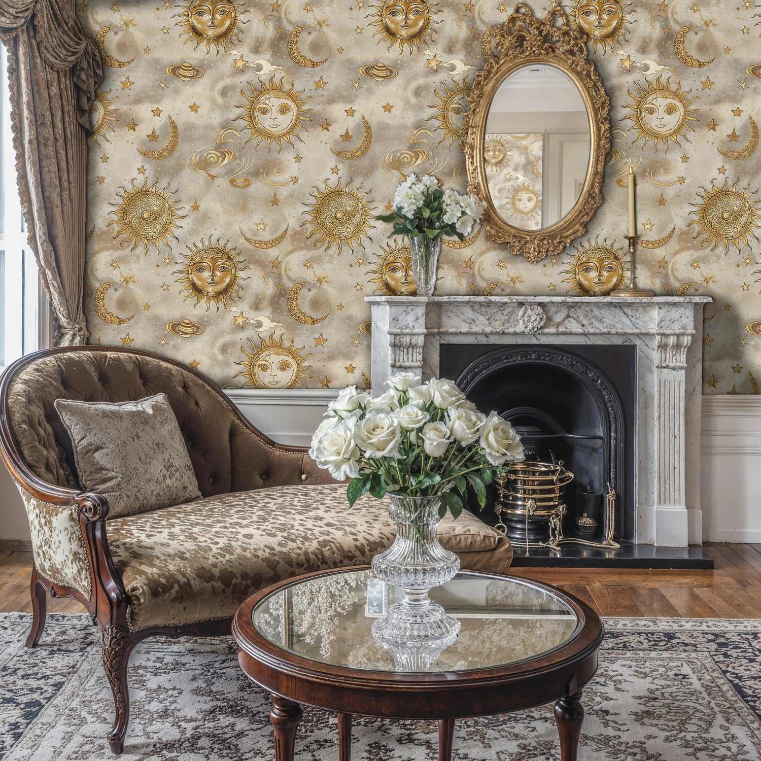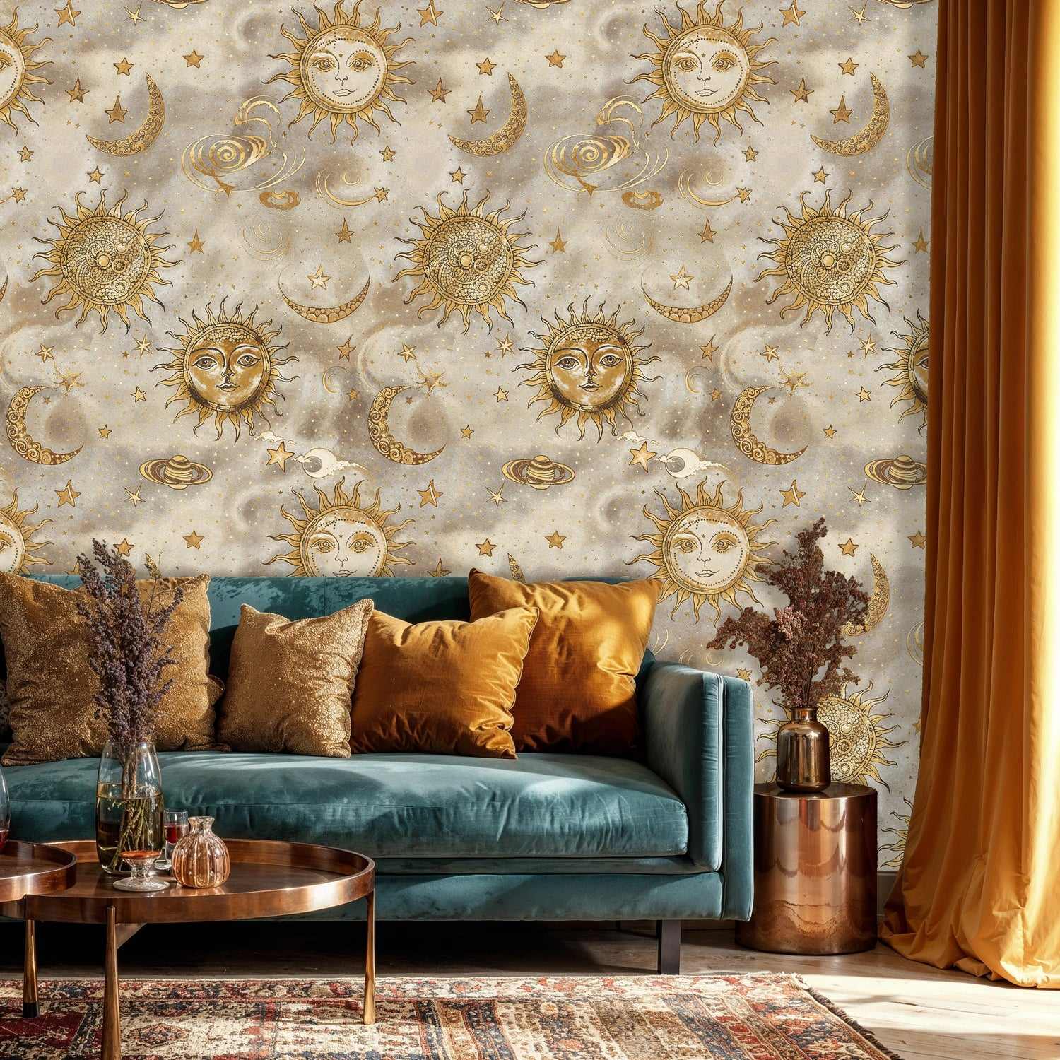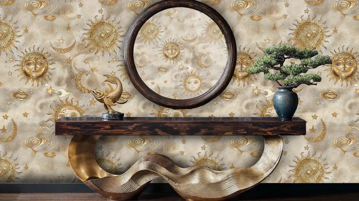 Enhance the golden tones with brass accents, smoked glass, and dark woods, or lean into softness with ivory textiles and velvet. This celestial design complements modern glam, eclectic, and vintage-inspired interiors, and it shines as an accent wall behind a sofa, bed, or dining setting.