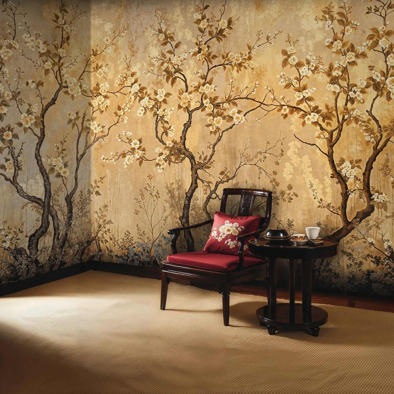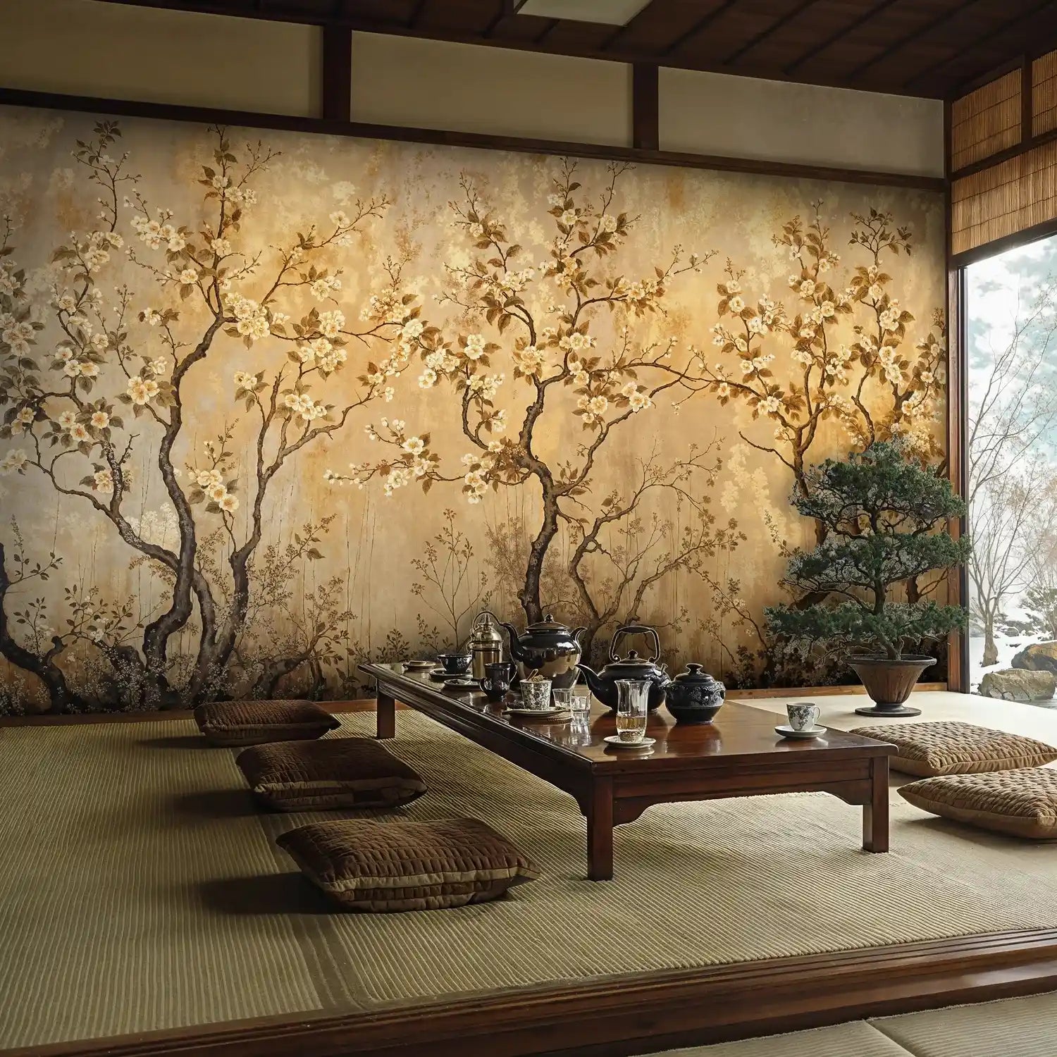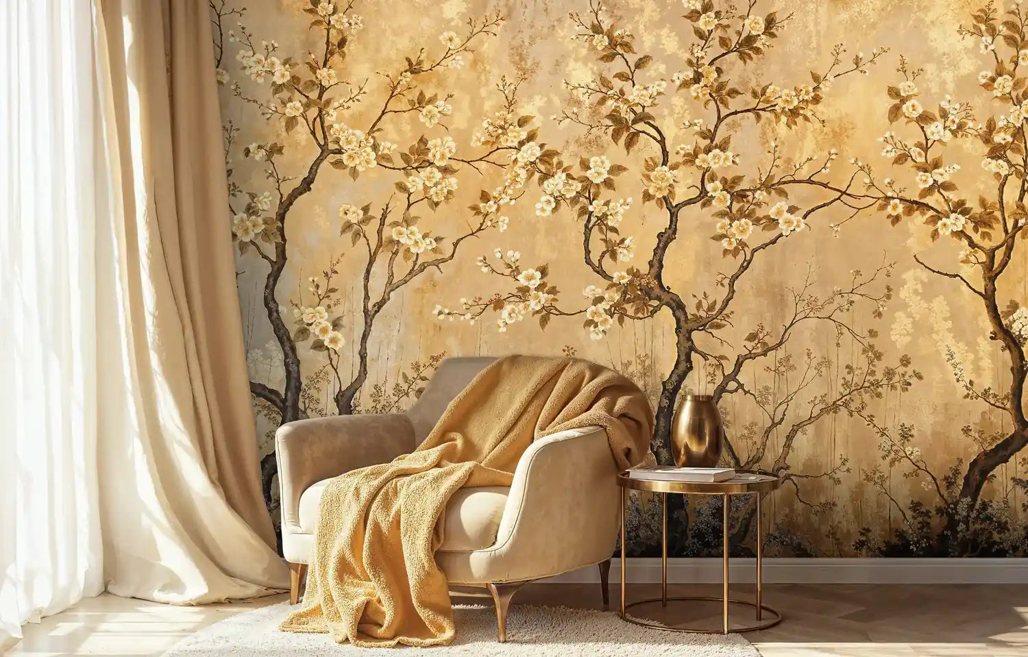 Golden light washes over an aged fresco as sinuous trunks lift clouds of creamy blossoms, their branches drifting like quiet music across the room. This Chinoiserie-inspired Wall Mural feels hand-painted and timeless, balancing organic movement with a softly textured glow. Designed by Atelier Merien, it frames your space like a tranquil garden scene—welcoming morning sun, candlelit dinners, and unhurried conversations. Let the delicate blooms, earthy trunks, and layered backdrop create a calming focal point that makes any room feel curated, intimate, and effortlessly elegant.