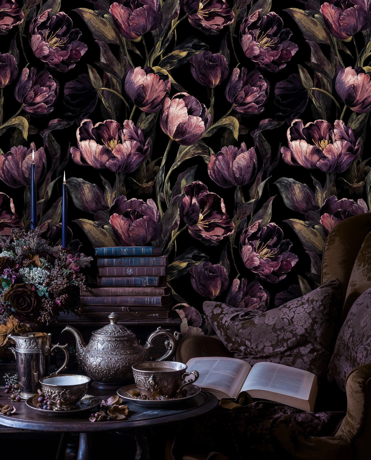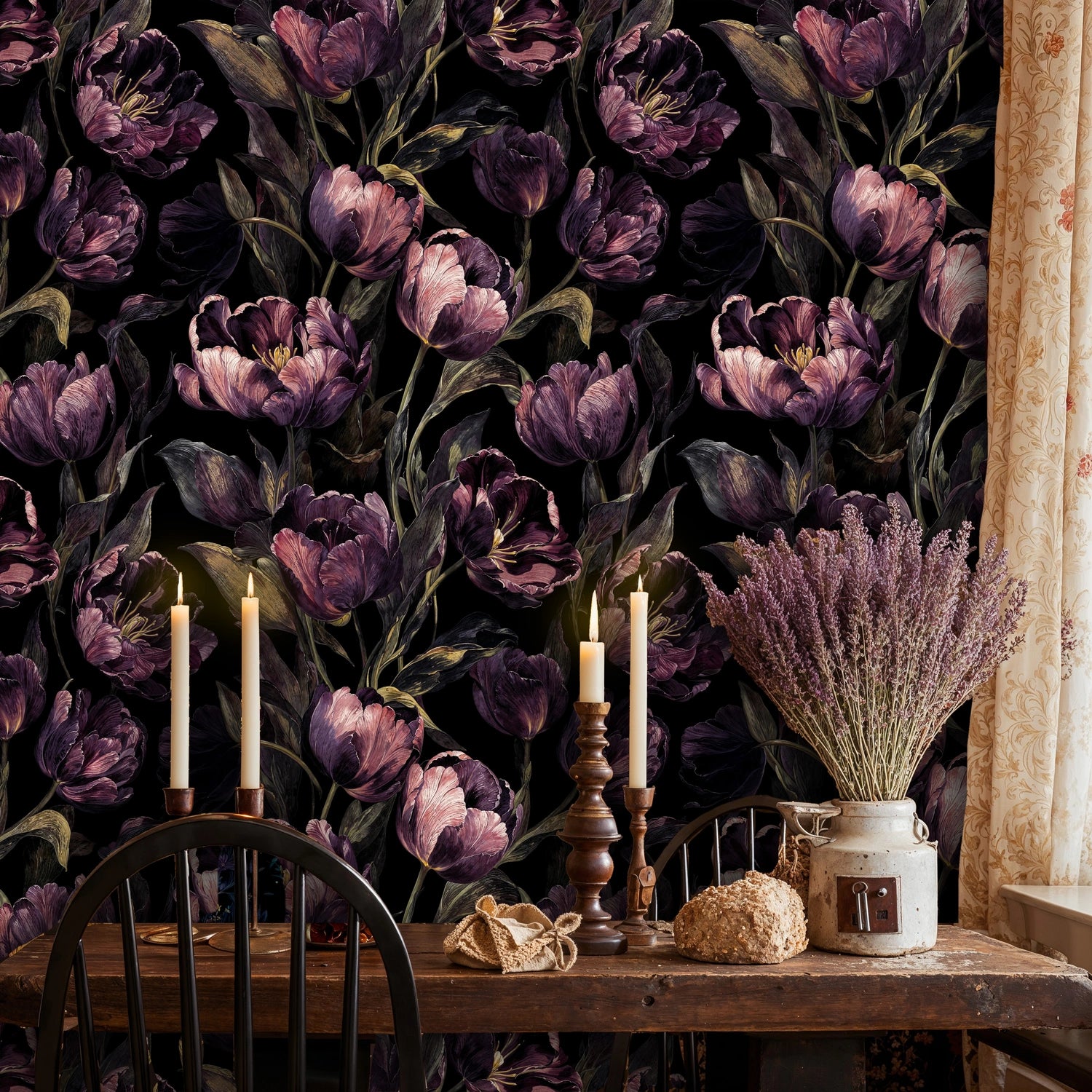 Step into a world where dramatic beauty meets botanical elegance. This stunning wallpaper captures the essence of a moonlit garden, where deep purple tulips bloom against the darkness like precious jewels. Inspired by classical oil paintings and romantic floral artistry, each bloom tells a story of quiet luxury and timeless sophistication. Atelier Merien presents this masterpiece that transforms any room into an intimate haven of artistic expression and natural wonder.