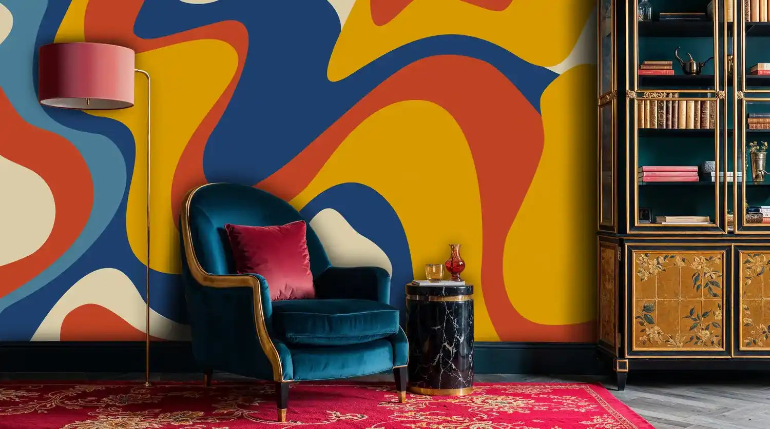 Step into a world where fluid motion meets bold expression with this captivating retro-inspired wall mural. Drawing from the free-spirited design movements that celebrated organic forms and vivid color palettes, this design transforms any wall into a dynamic canvas of flowing shapes and energetic hues. The sweeping curves in rich blues, warm oranges, and golden yellows create an atmosphere of creative freedom and artistic sophistication. Atelier Merien has crafted this Wall Mural to bring the essence of contemporary art directly into your living space, making every room a gallery of modern expression.