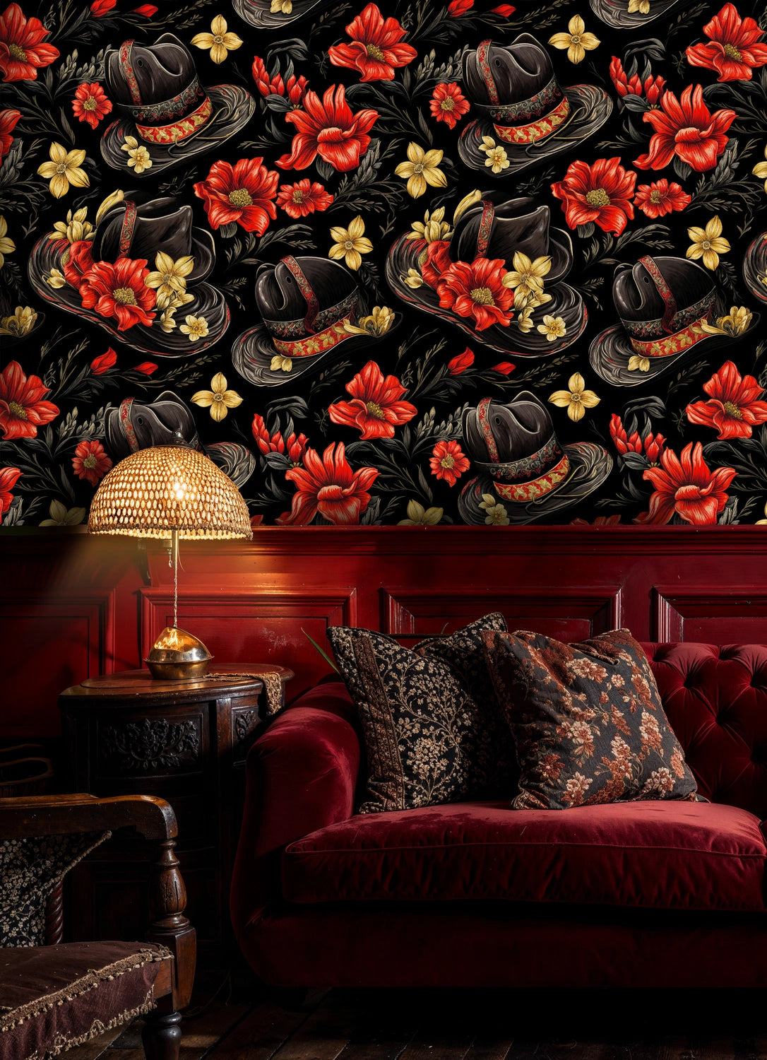 Imagine dusk settling over a gilded saloon as polished brims rest among lush blooms. This Wallpaper interlaces ornate Western hats with lavish poppies and petite golden blossoms against a jet-black ground. Inspired by hand-painted folk motifs and cinematic Americana, the composition balances grit with glamour. Each sweep of the brim and embroidered band is rendered with painterly depth, while the florals glow like stage lights. Whether you crave a statement wall or a fully enveloping backdrop, the pattern feels both romantic and rebellious. Crafted by Atelier Merien, it invites you to tell a story at home—one of wanderlust, warm leather, and evenings lit by lamplight.
