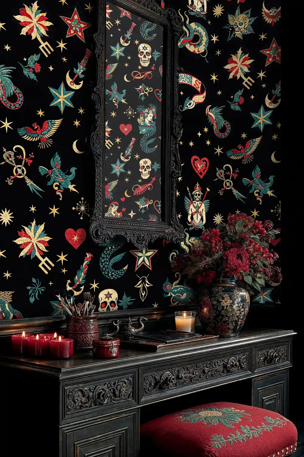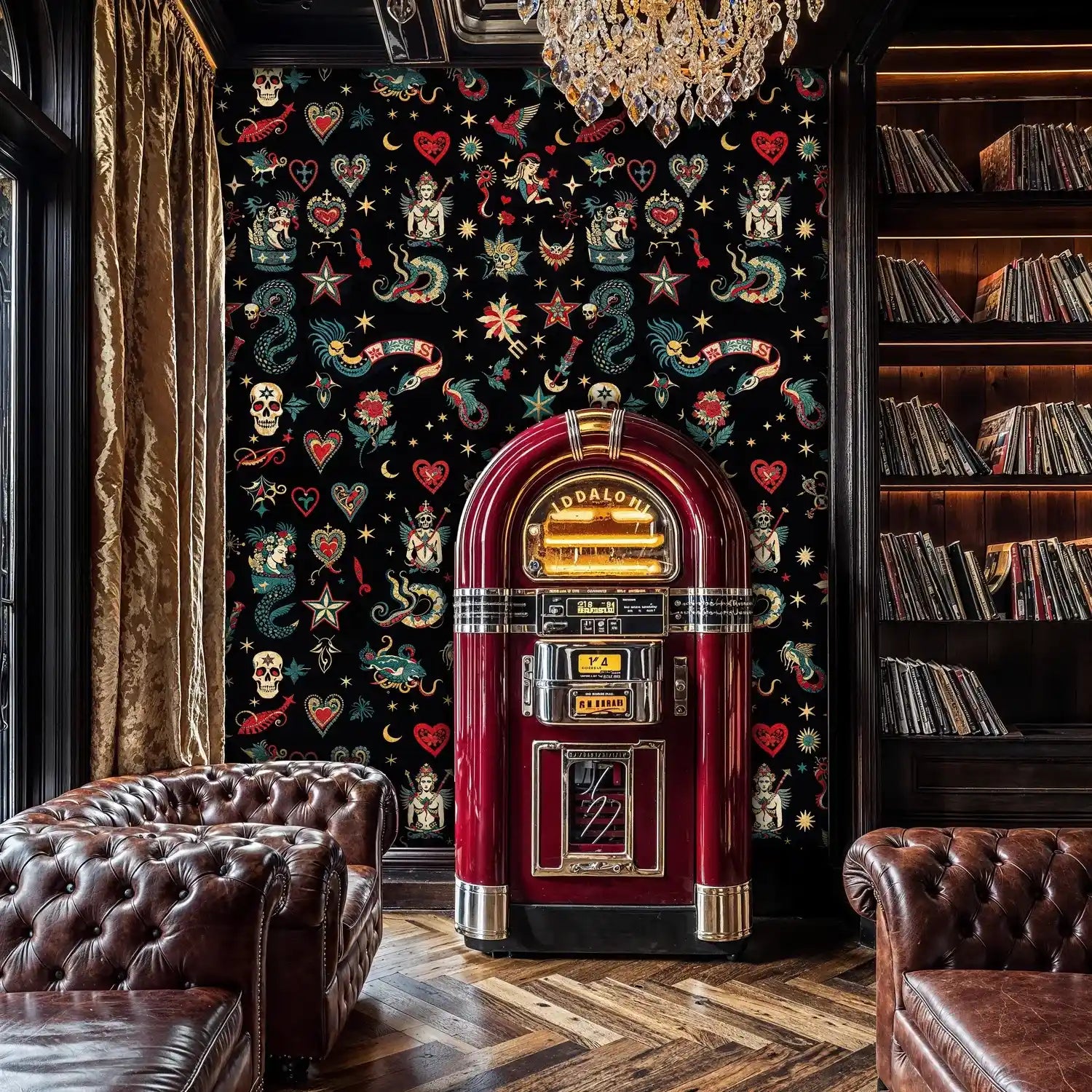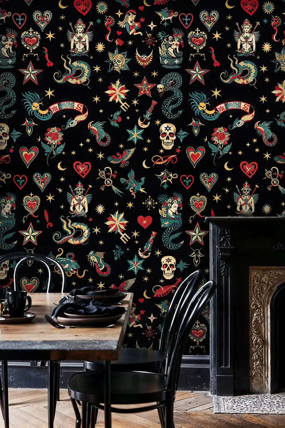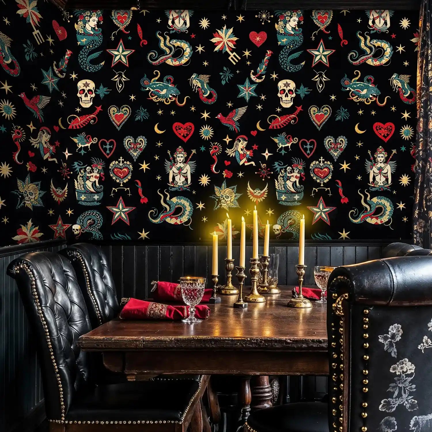 Step into a world where traditional tattoo artistry meets sophisticated interior design. This striking Wallpaper brings together the rebellious spirit of classic American tattoo culture with timeless elegance, creating an atmosphere that's both daring and refined. Featuring an intricate tapestry of mermaids, skulls, sacred hearts, serpents, and celestial stars set against a rich black backdrop, this design captures the essence of vintage tattoo parlors and transforms it into a work of art for your walls. Each element tells a story of love, loss, adventure, and mystique, making your space a conversation starter that reflects your bold personality. Atelier Merien has carefully curated this design to celebrate the artistry and symbolism that makes tattoo culture so captivating.
