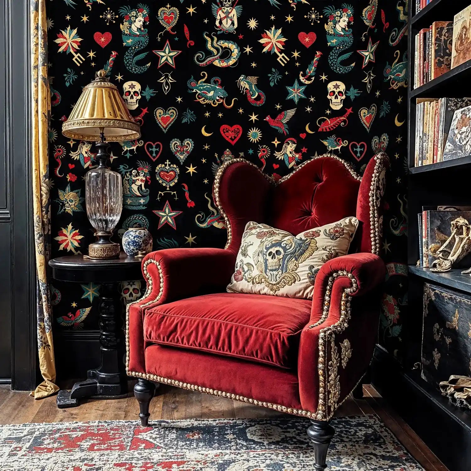 This wallpaper works beautifully in spaces that embrace bold design choices. Consider it for a home bar, study, or powder room where you want to make a dramatic statement. Pair it with rich leather furniture, vintage brass accents, and warm lighting to create an atmosphere that's both edgy and inviting. The design also works wonderfully as an accent wall in bedrooms or living spaces for those who appreciate unconventional beauty.