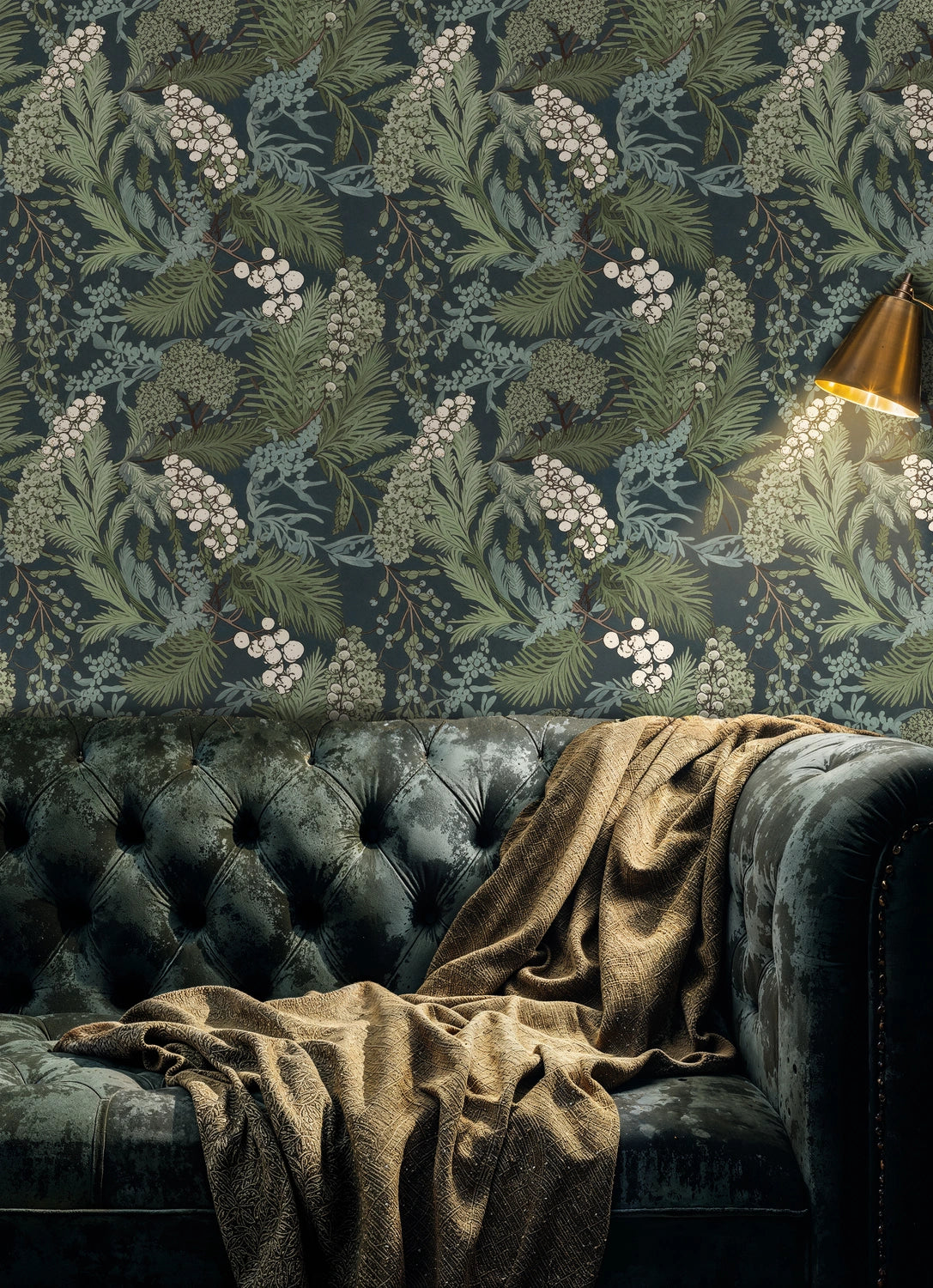 - A deep navy/teal background with layered sage and olive greens, accented by soft ivory berry clusters and subtle brown stems.