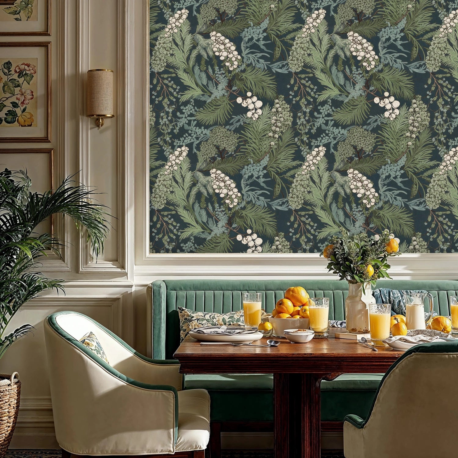 Use it to anchor a living room, add cocooning calm to a bedroom, or elevate a dining nook. Complement with tactile fabrics, matte metals, and botanical accents to echo the motif and craft a cohesive, collected interior.