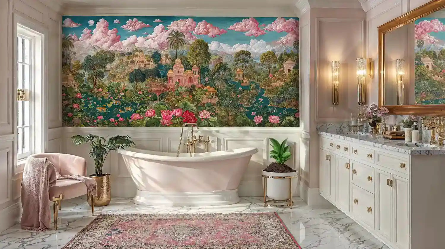 This design works beautifully in dining rooms where it creates an intimate, luxurious atmosphere, or in bathrooms where it transforms daily routines into spa-like experiences. The warm coral and pink tones pair elegantly with gold accents, marble surfaces, and rich textiles, making it ideal for maximalist and eclectic design schemes.