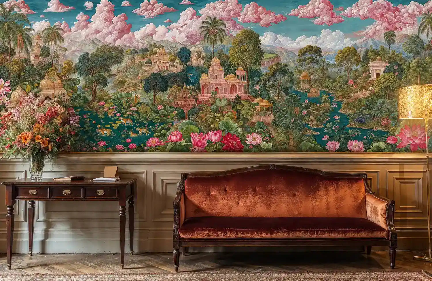 Step into an enchanted realm where majestic palaces rise through lush tropical foliage and vibrant lotus blossoms dance across serene waters. This exquisite Wall Mural captures the timeless beauty of palatial gardens, where ornate architecture meets nature's most spectacular displays. Inspired by the grandeur of royal landscapes and the delicate artistry of botanical illustrations, this design by Atelier Merien transforms any room into a sophisticated sanctuary that whispers tales of distant lands and forgotten kingdoms.