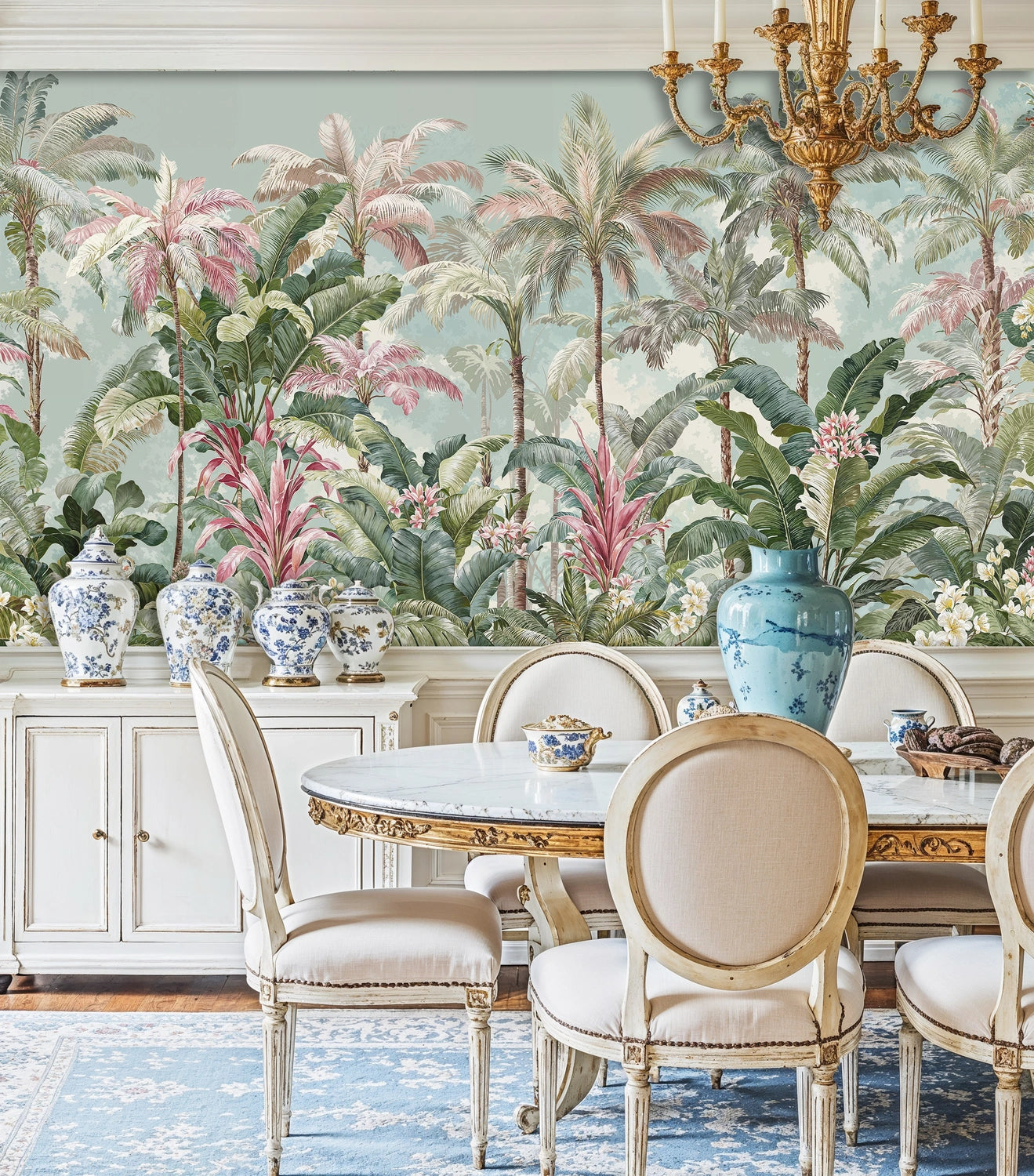• Effortless Statement: Large-scale palms deliver drama while the airy background keeps rooms light.