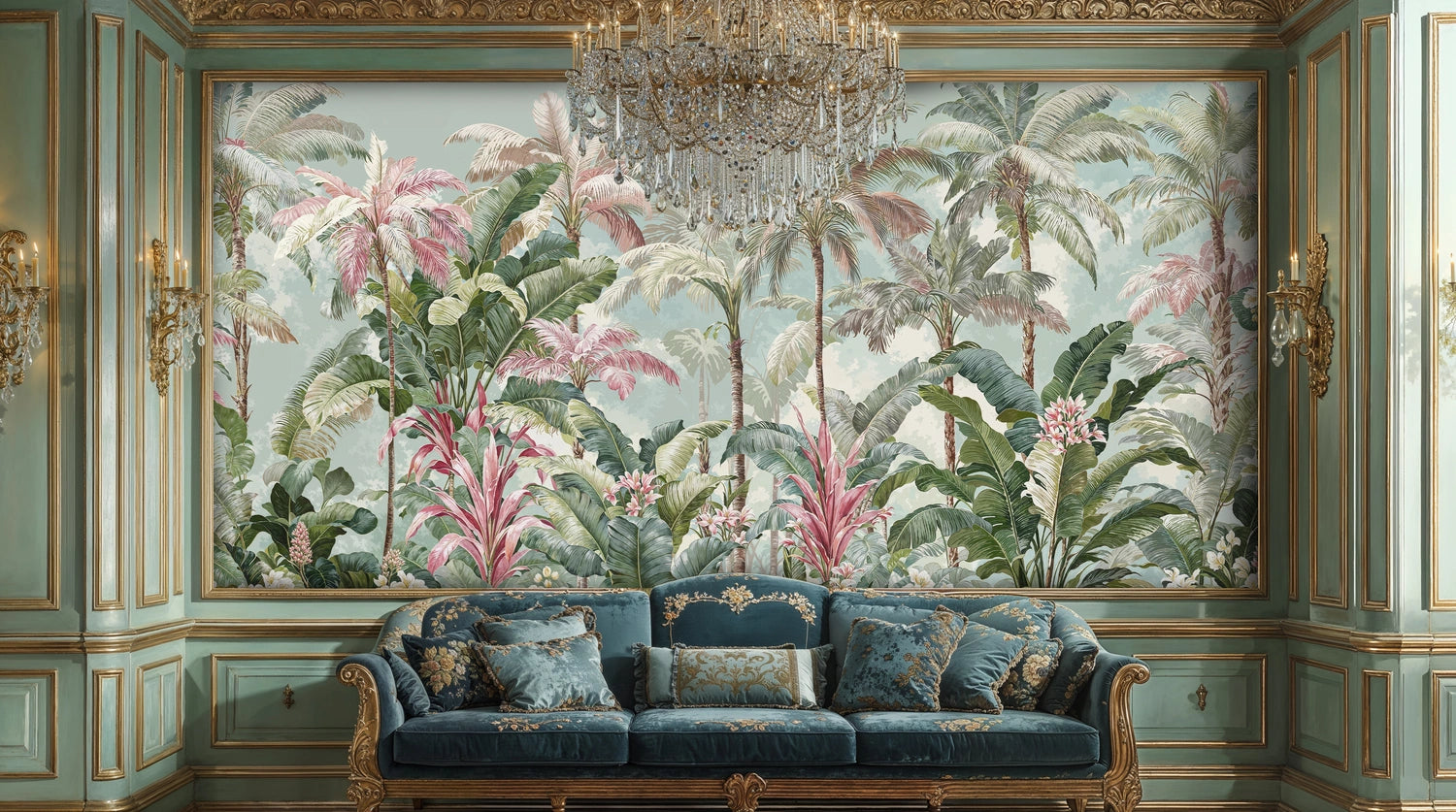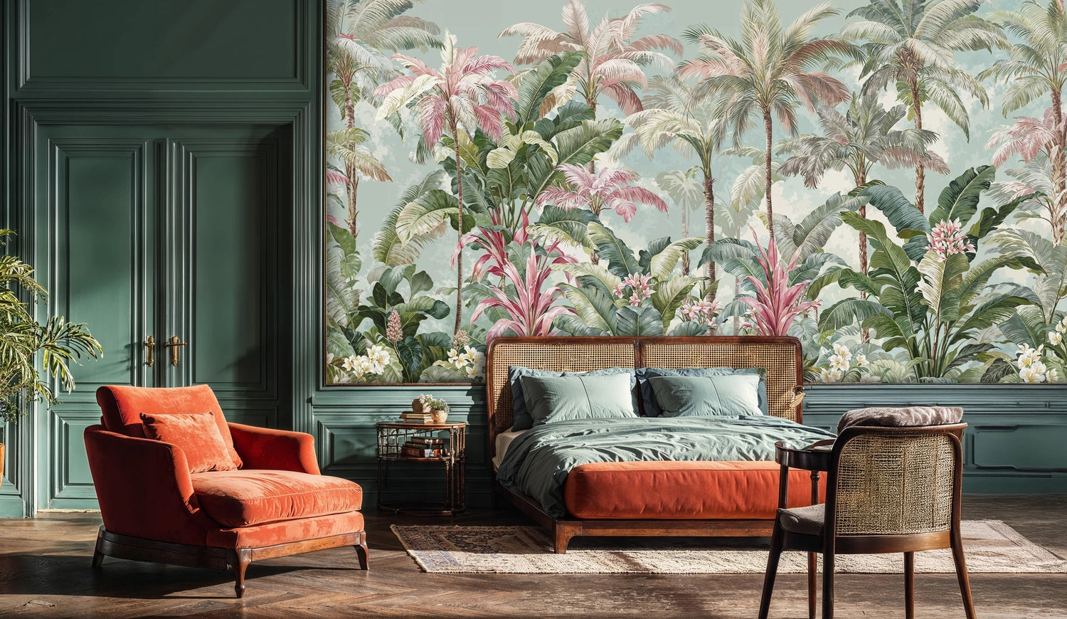 Match this botanical wall mural with woven textures, cane or rattan furniture, and light woods for a relaxed resort feel. For elevated glam, add velvet seating, brass accents, and crystal lighting. Soft teal, ivory, blush, and natural tones keep the look cohesive.