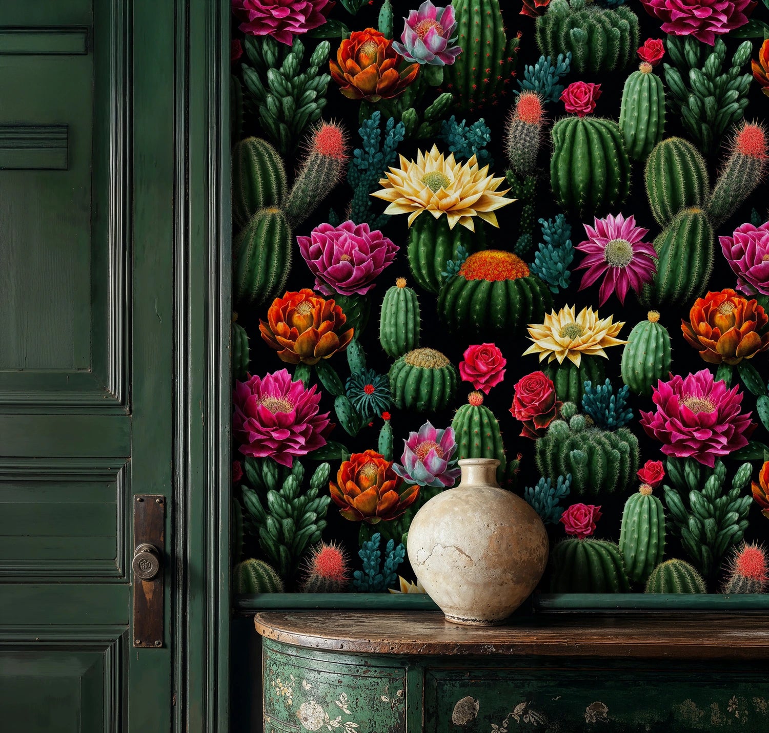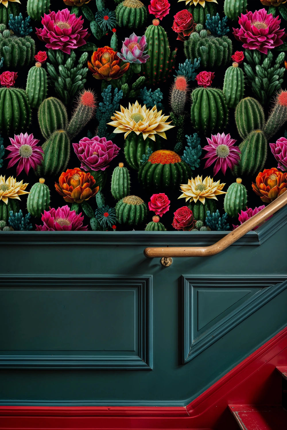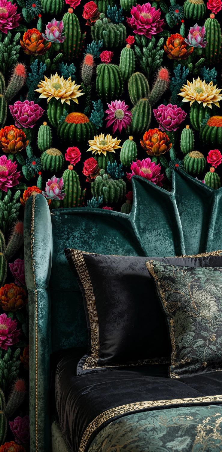 - This bold desert cactus design perfectly complements maximalist, bohemian, eclectic, and contemporary tropical interior styles. The dramatic black background and vibrant blooms work especially well in spaces that celebrate bold patterns and rich color palettes.