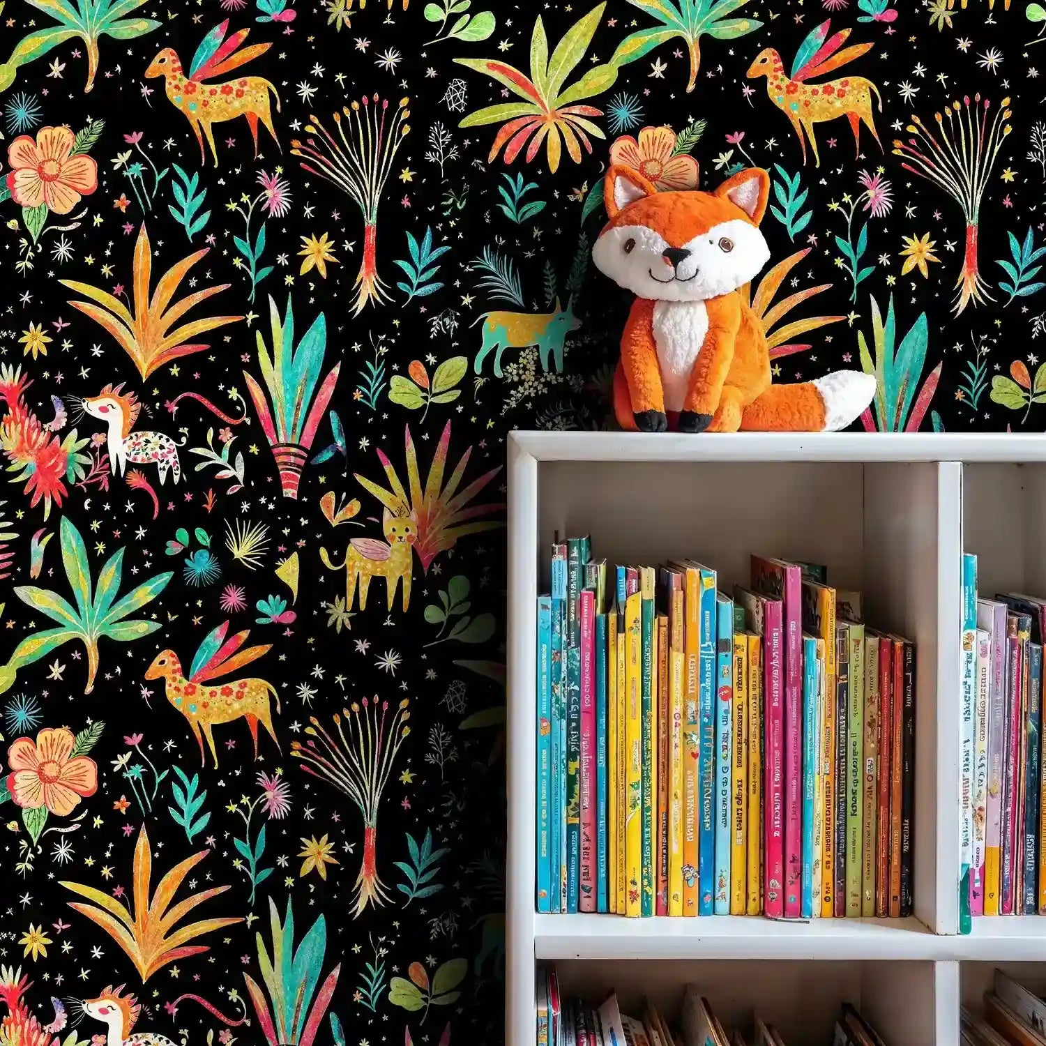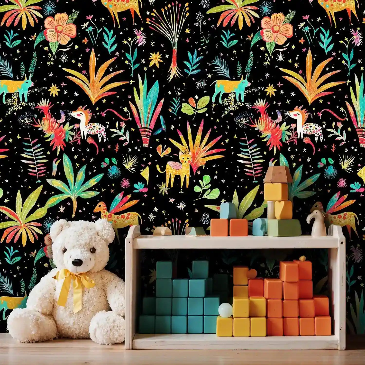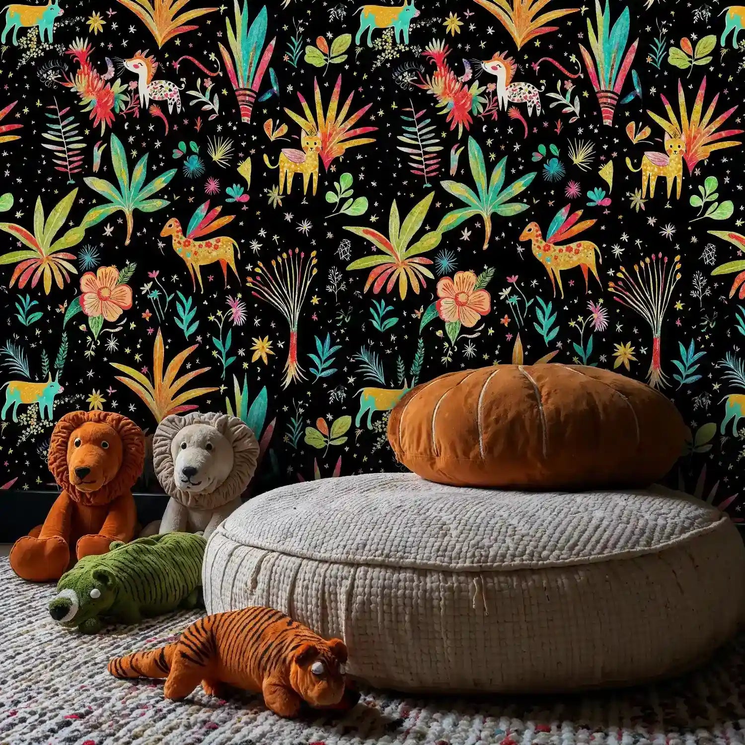 Step into an enchanted world where vibrant safari animals dance beneath starlit skies and tropical blooms burst with life. This whimsical wallpaper design captures the wonder of childhood imagination, featuring playful deer, majestic cranes, and exotic flora rendered in brilliant watercolor hues against a rich black canvas. Inspired by folk art traditions and botanical illustrations, this Atelier Merien wallpaper creates an atmosphere of discovery and joy that will spark your child's creativity and sense of adventure.