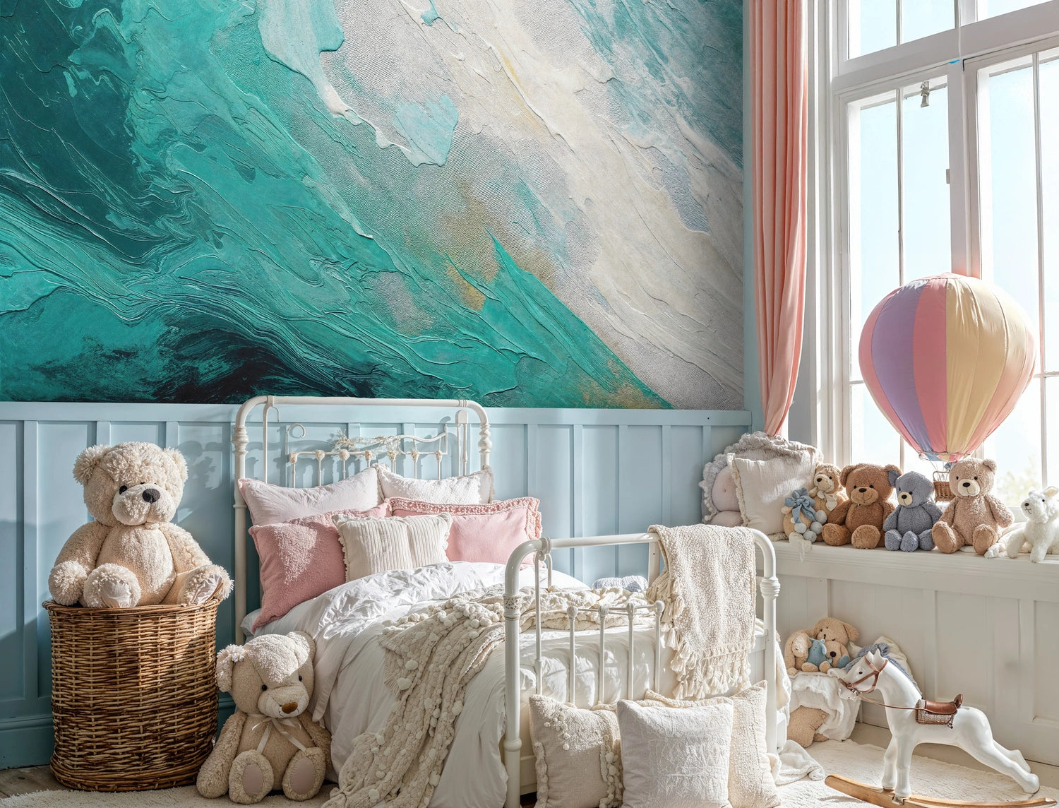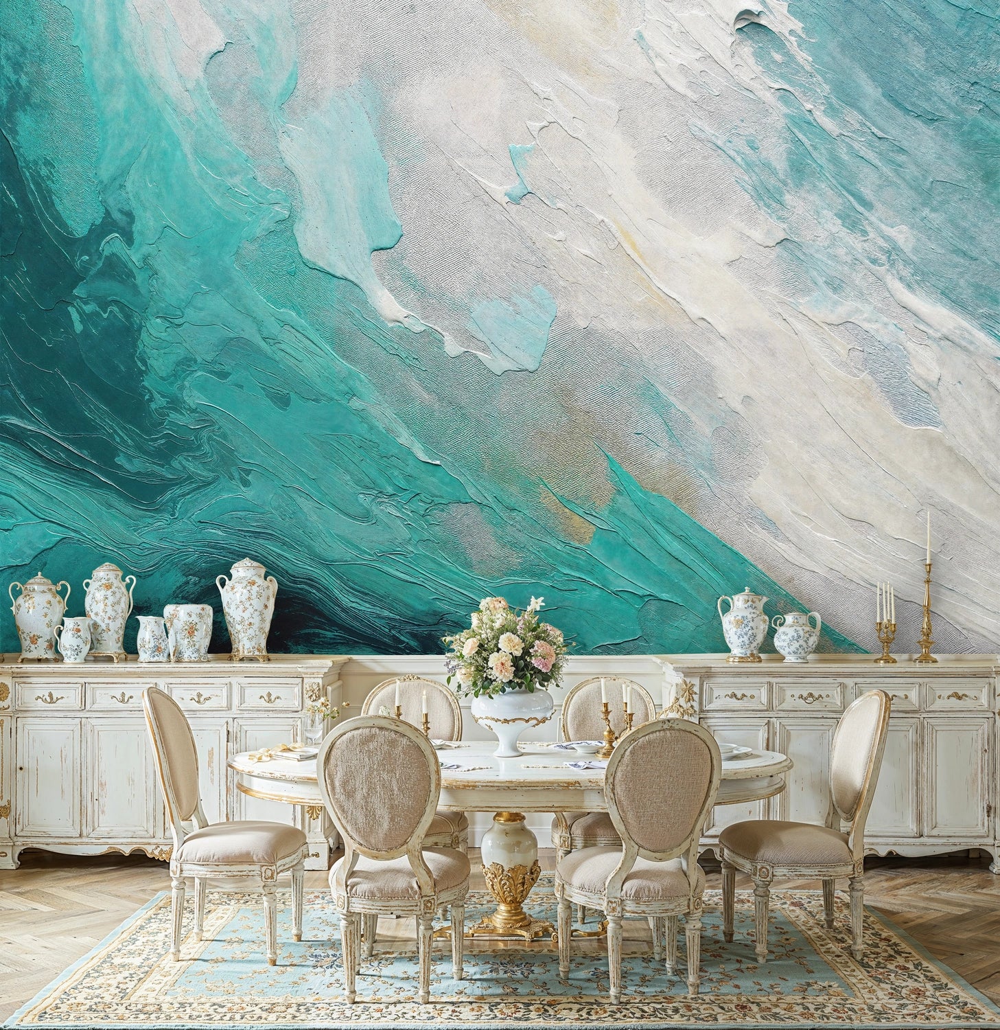 Each brushstroke in this mural tells a story of movement and flow, with layers of turquoise, teal, and cream creating depth and dimension that changes throughout the day as light shifts across your walls. The abstract nature allows viewers to discover new details and interpretations with each glance.
