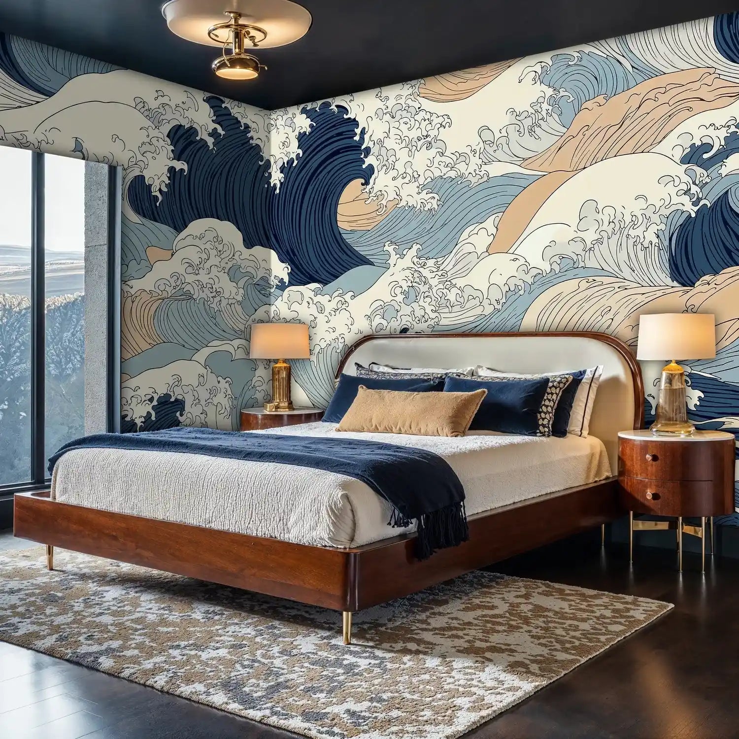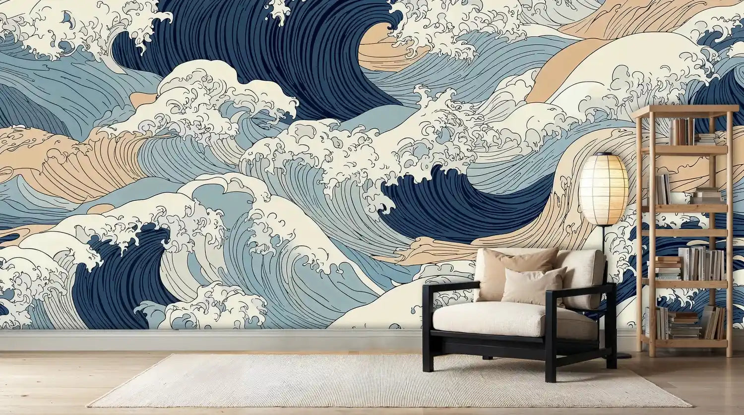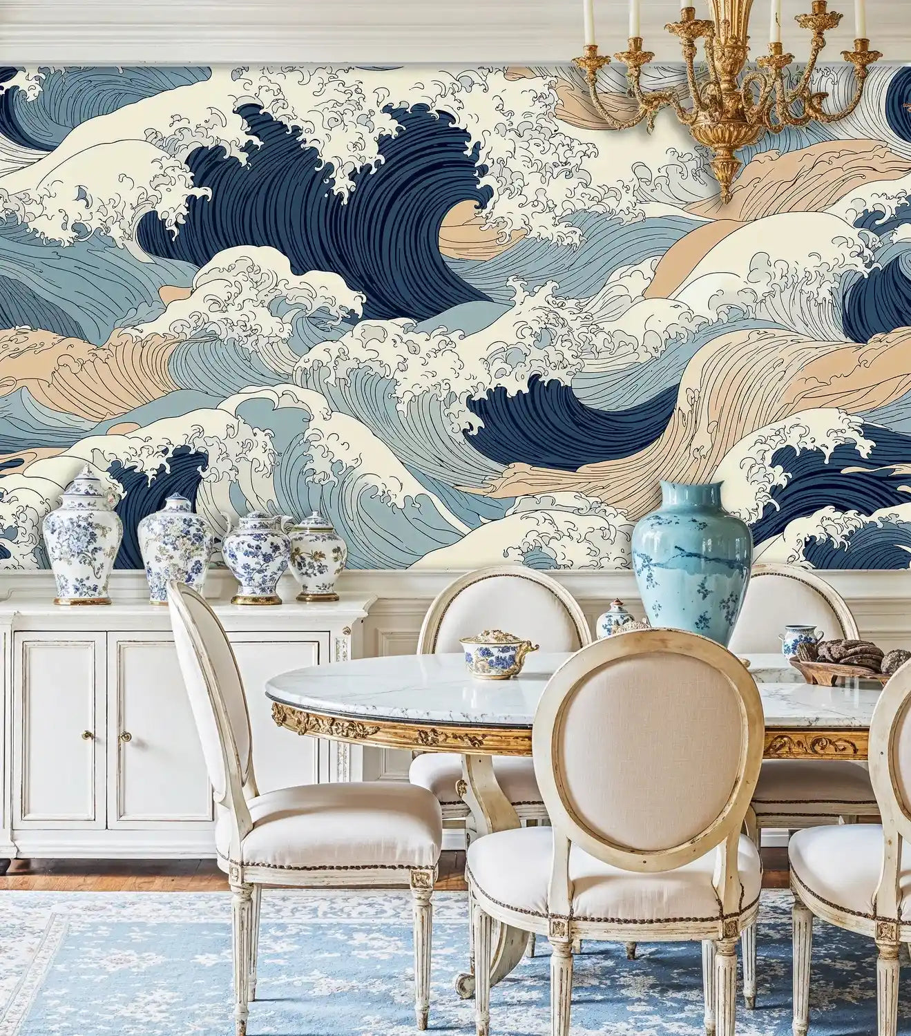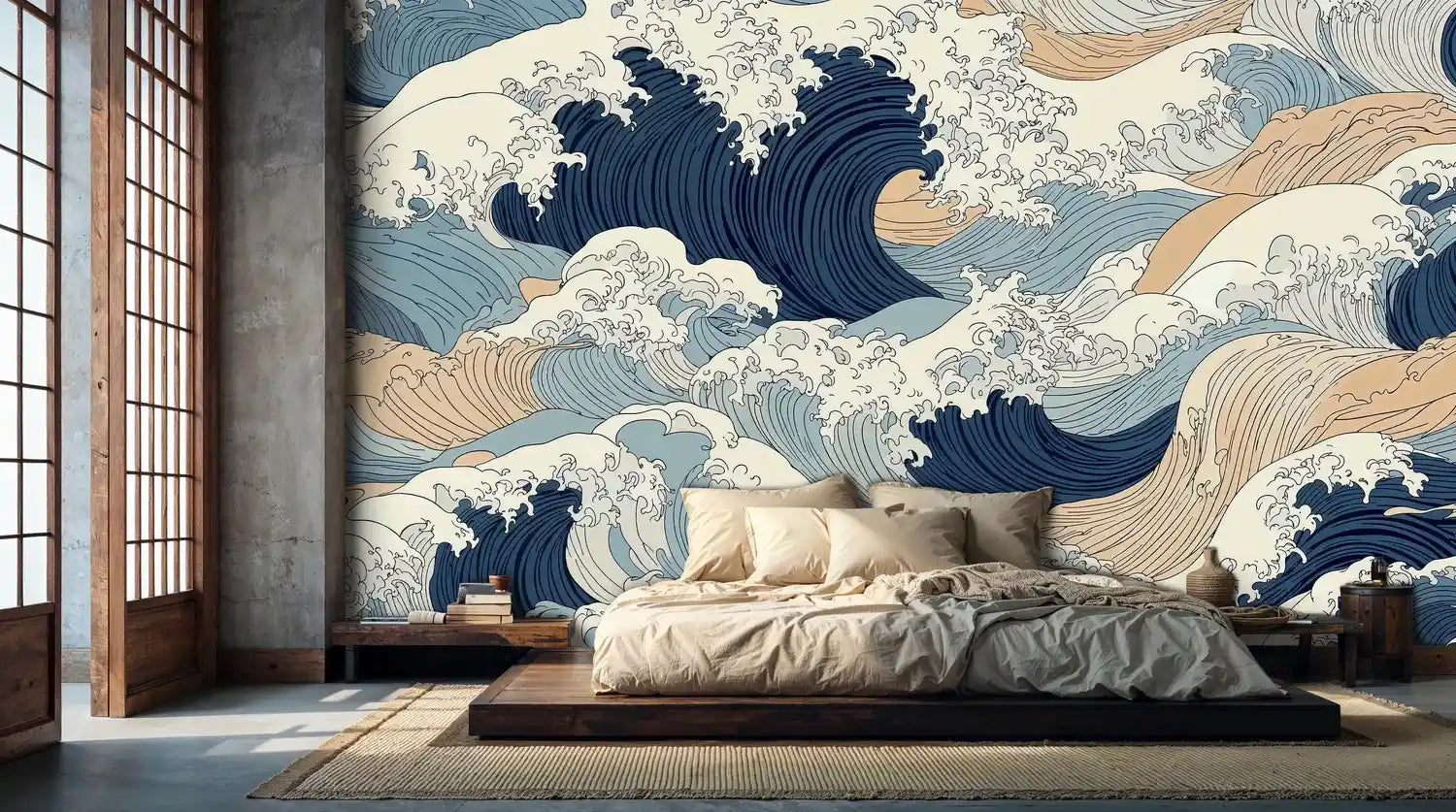 This intricate wave pattern showcases masterful linework and sophisticated color gradations that bring depth and movement to your walls. The interplay of deep navy crests with lighter blue undertones creates visual texture that changes throughout the day as light shifts across the surface.
