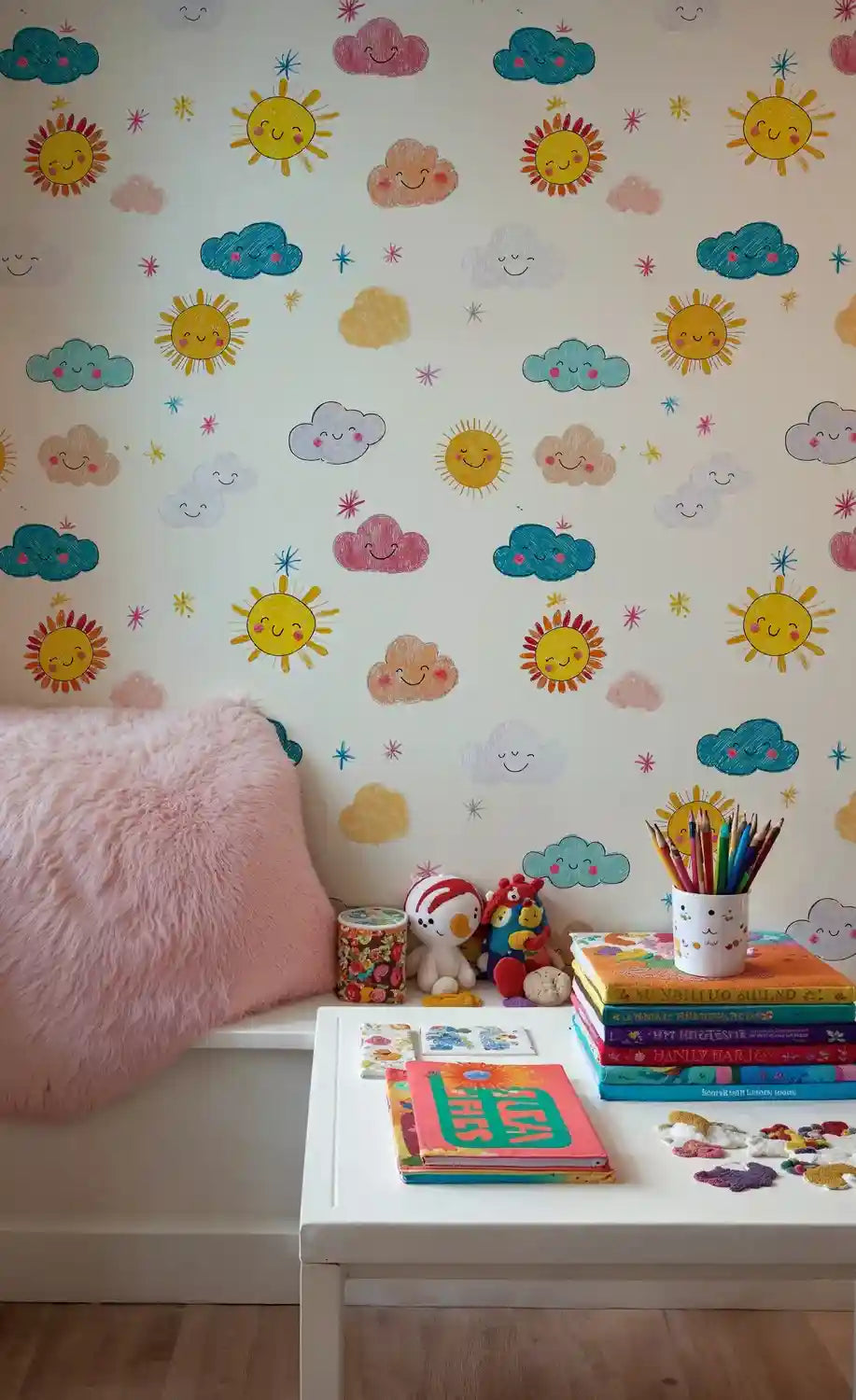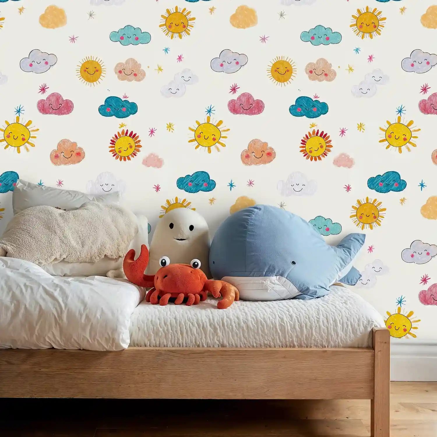 Watch as your little one's room comes alive with the magic of sunshine and wonder. This delightful wallpaper captures the pure joy of childhood through cheerful hand-drawn suns and fluffy clouds, each adorned with sweet smiling faces. Inspired by children's storybook illustrations, the whimsical design brings warmth and happiness to any space. The playful pattern features golden sunshine, colorful clouds in soft pastels, and twinkling stars scattered across a cream background. Atelier Merien has crafted this design to spark imagination and create a nurturing environment where dreams take flight.