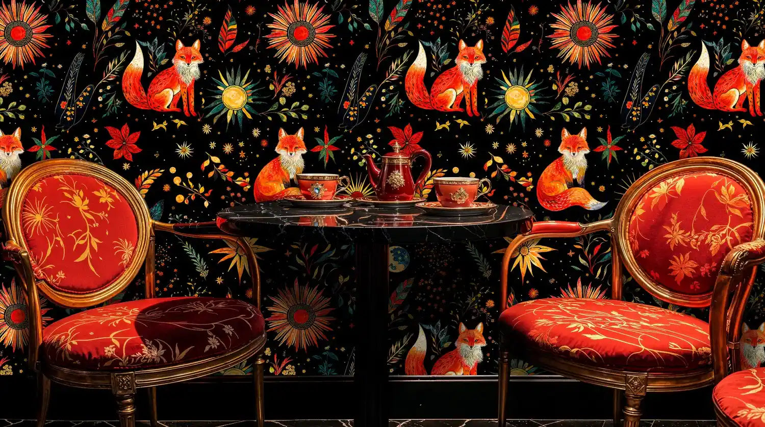 Imagine a midnight grove where firelight glows across glossy leaves and constellations drift between blooms. In this Wallpaper, radiant foxes rest among sunbursts, planets, and twinkling stars, painted with folk-art charm and luminous detail. A deep black ground lets oranges and golds sing, while teal and emerald foliage softens the scene. Inspired by stargazing walks through woodland clearings and the storytelling spirit of folklore, the composition feels both magical and welcoming. Crafted by Atelier Merien, it invites wonder into cozy reading corners, atmospheric dining rooms, and moody bedrooms alike.