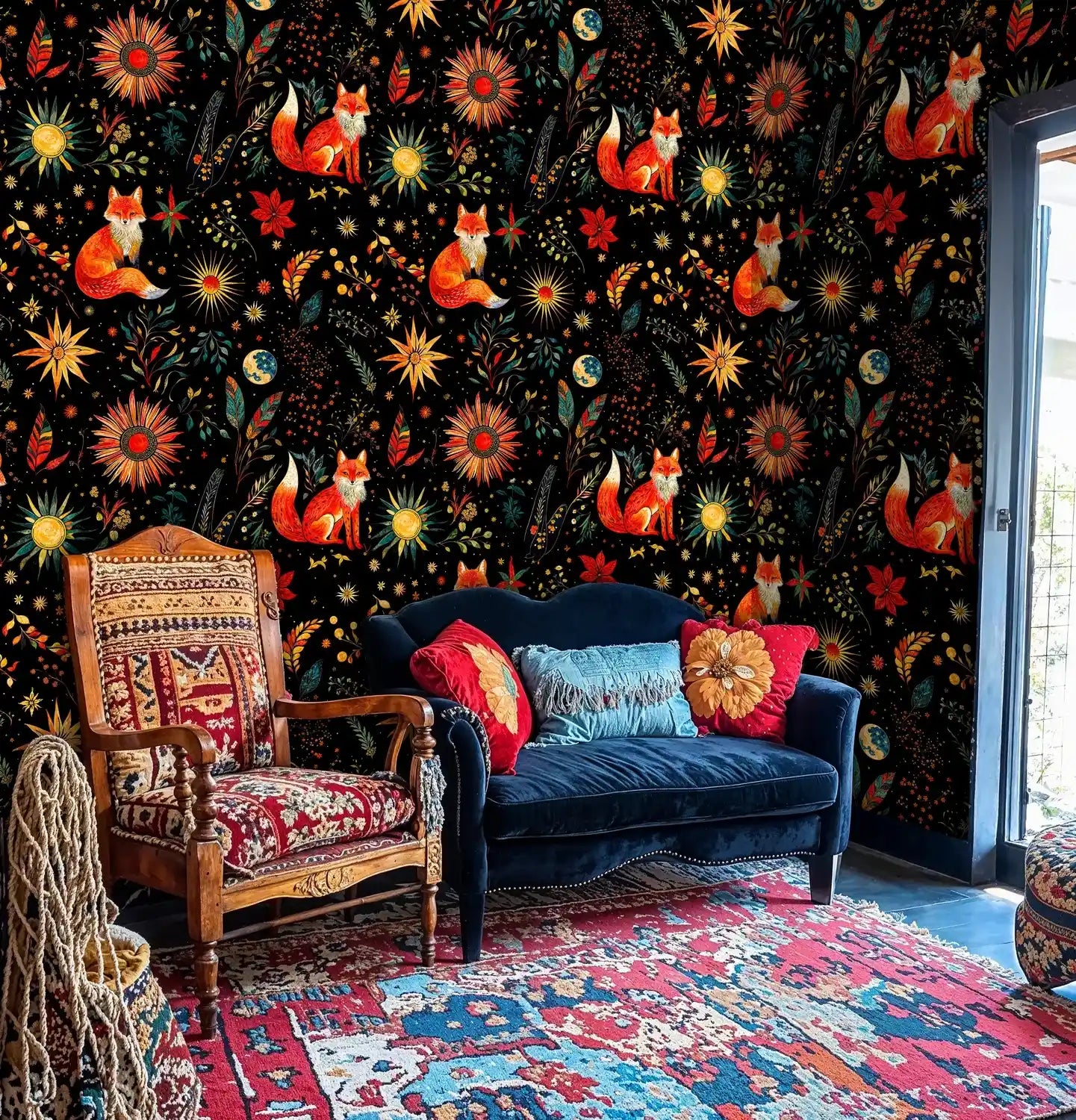 - Its moody night-sky ground and folk-art motifs pair beautifully with Maximalist, Eclectic, Boho, and Dark Academia interiors. It also adds a dramatic counterpoint to Modern or Japandi spaces when balanced with clean lines and warm metallic accents.